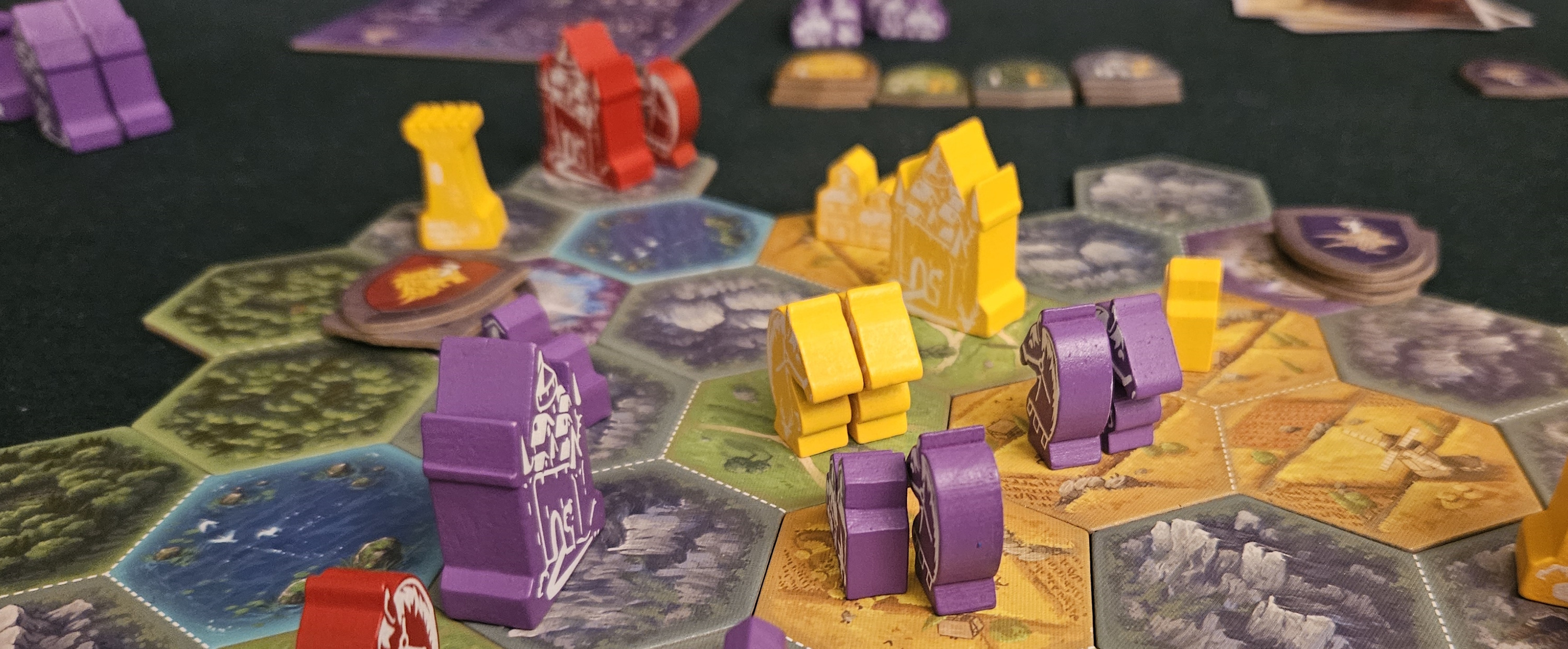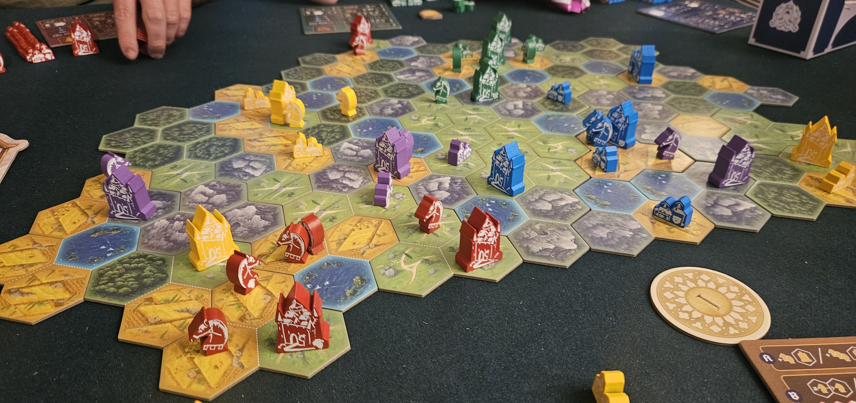 Welcome to Feudal Europe. As a knight in the service of the king, you and a handful of others have been tasked with settling an otherwise pristine landscape. “Pristine” as in “devoid of human habitation.” Hoo boy, we’re really ripping through the Classic Eurogame checklist! Anyway, your objective is to send knights to the realm’s richest tracts, found towns and cities, and gradually exchange your wealth for noble titles.