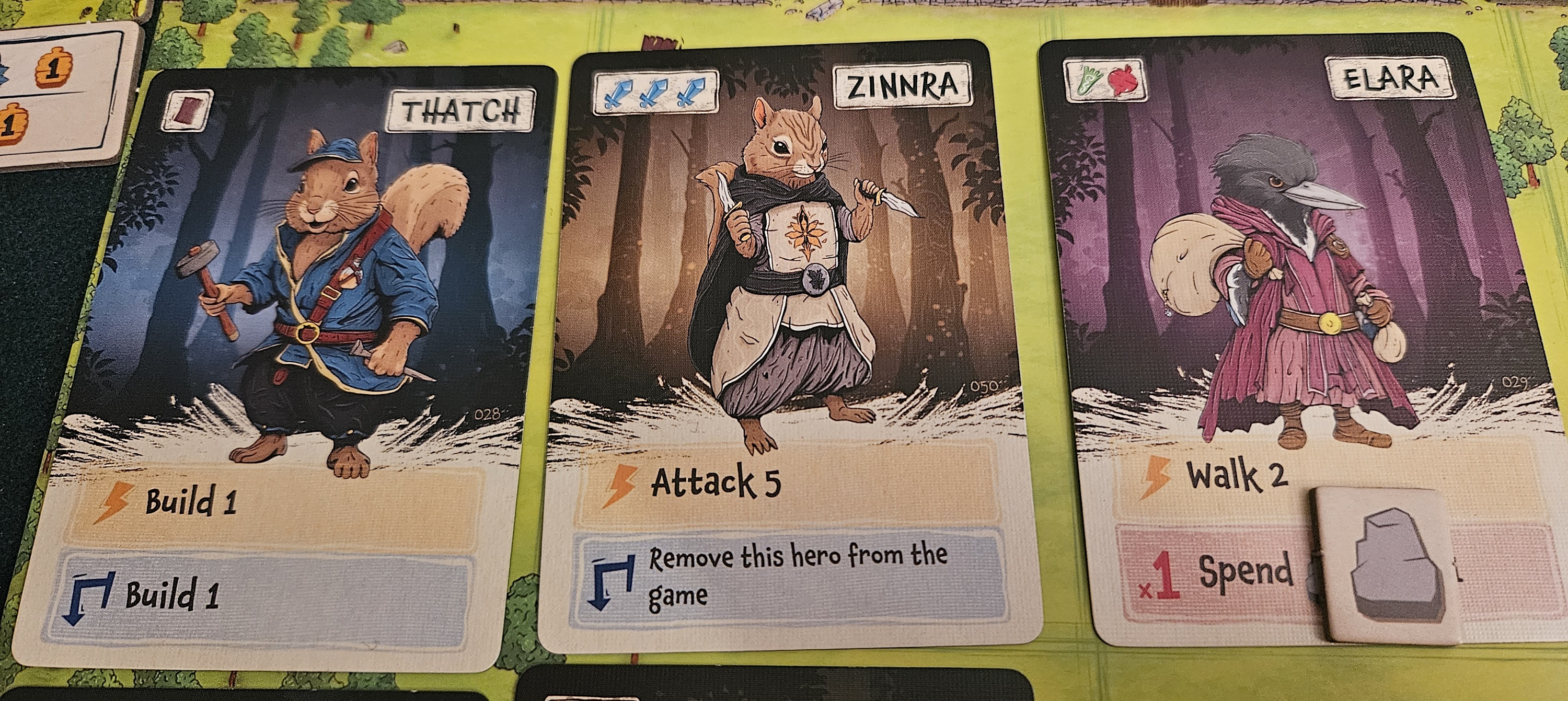 It goes like this. You have the right combination of food, timber, stone, and honey to place a building. So you affix the structure into the proper hex. You earn points for the size of your neighborhood, the connected structures that contain your re-homed animals. Depending on which animal you place in your newest structure, you trigger some bonus. Maybe extra resources. Maybe another goal card. Maybe something big, like a bunch of points for every clearing you’ve now populated. Something like that.