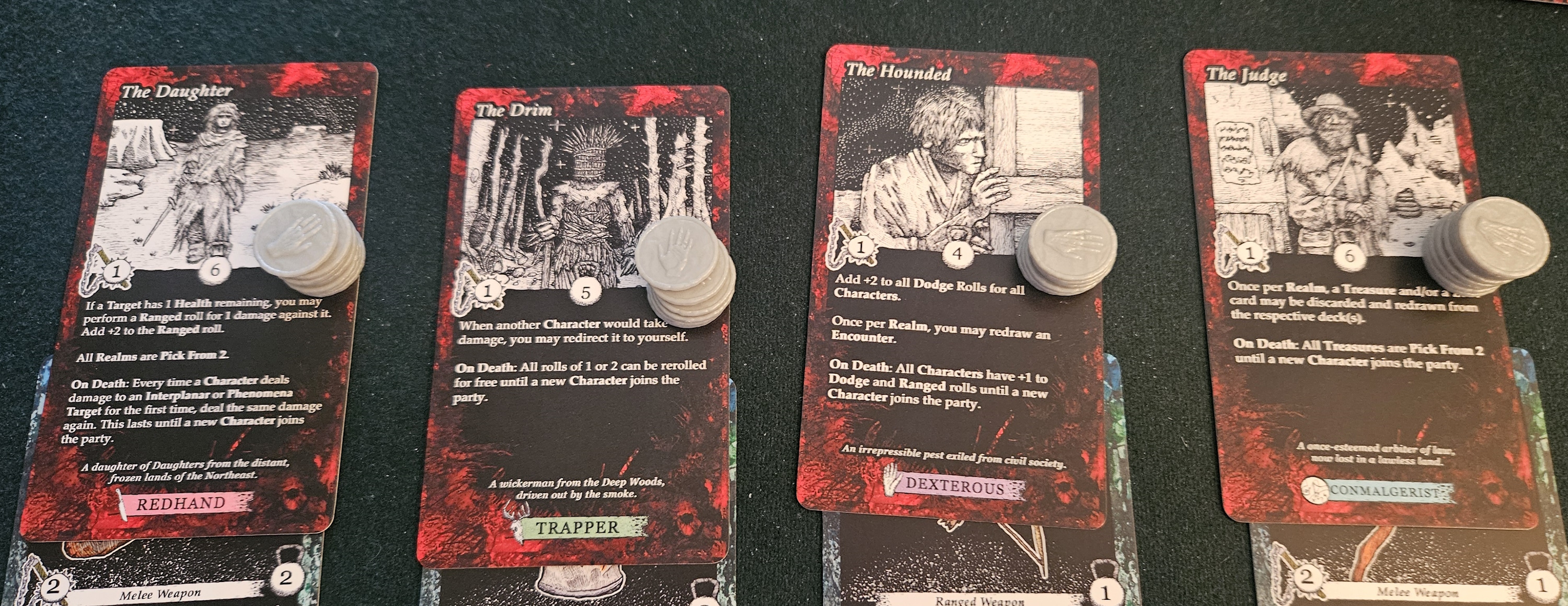 For all that, The Restless plays its actual adventuring surprisingly straight. The overarching structure presents itself in daunting fashion: you must pass through five blighted realms, each consisting of four encounters, before facing the traitor god. For the most part, this consists of flipping a card to see what happens. Most of the time, your crew will fall headlong into a combat encounter. These demand copious rolls and exchanged wounds; there’s nothing noteworthy or innovative to the combat itself, so I’ll decline to bore you with a description of how hits are tallied. The rest of the time, either you receive a run-of-the-mill text encounter (roll to determine whether you heal or gain an item, that sort of thing) or else you happen across a merchant. These latter options are the most involved. Provided you can pay the merchant’s toll, you’re offered a selection of items. There’s no currency, strictly speaking, although you can make change with reroll counters.