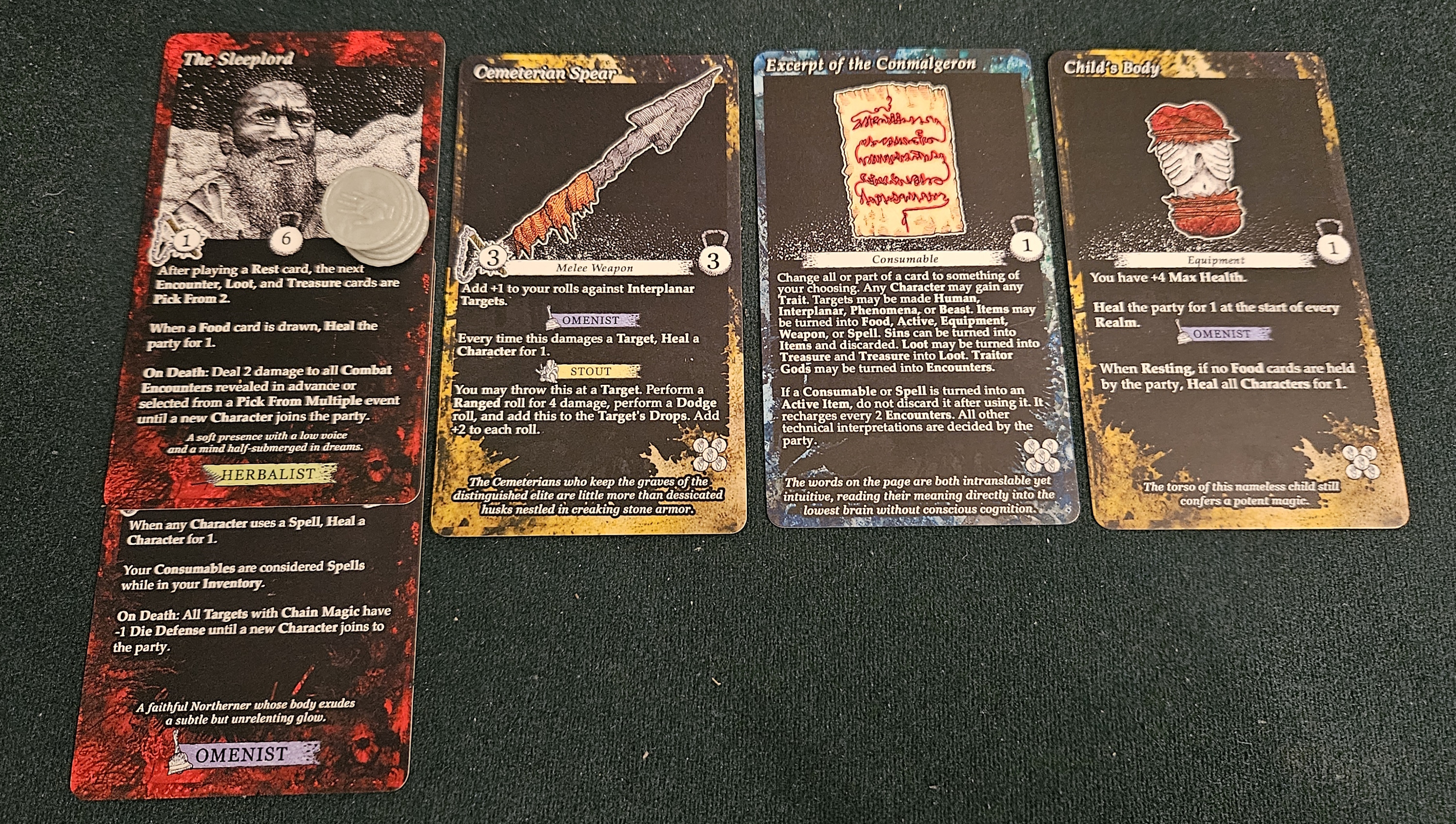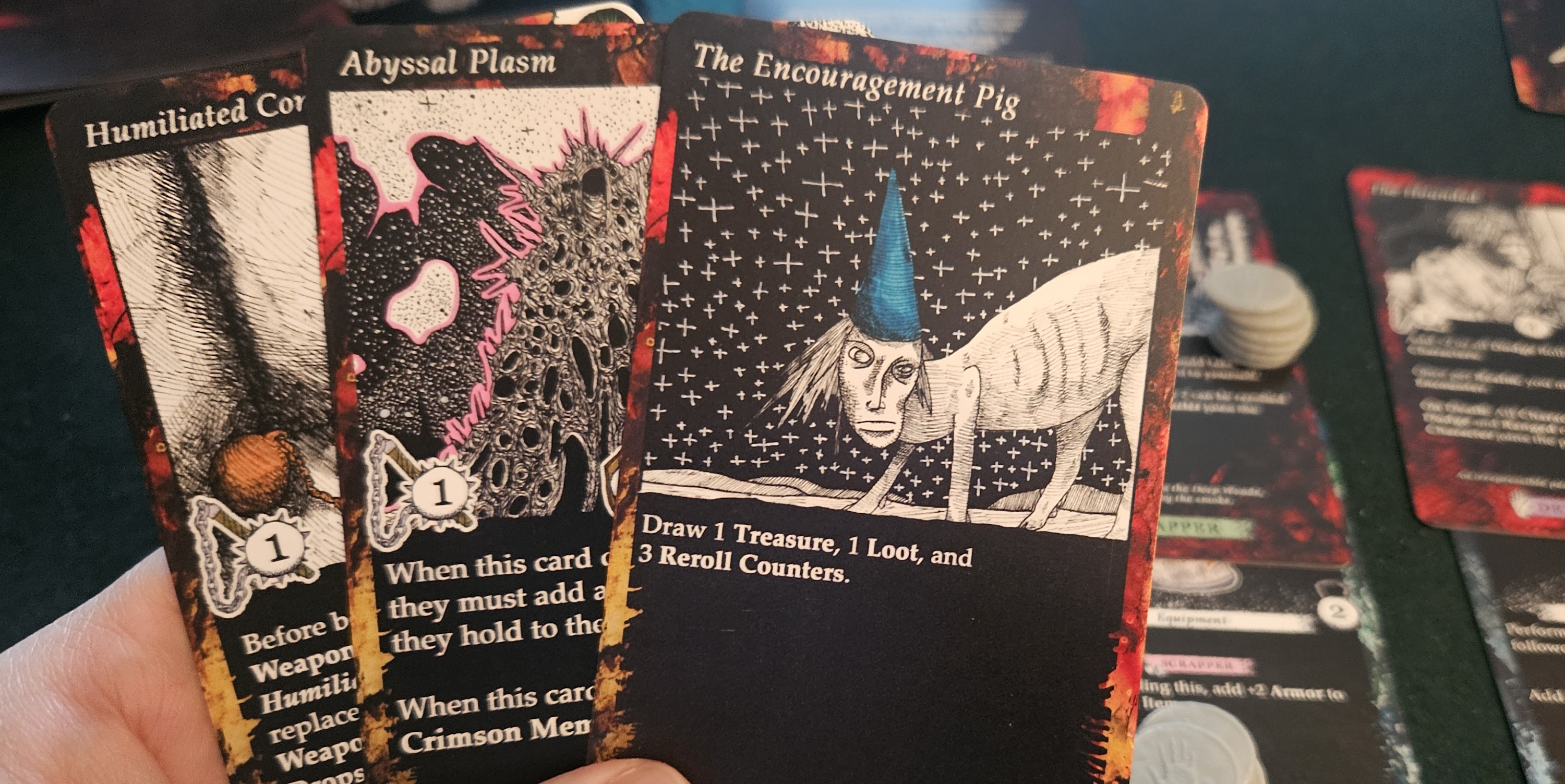 Dumaine’s cards are endowed with blacker arts as well, little tricks that upend the usual procedures. One example is found in the treasure deck. Periodically, your crew will draw a sin. These are sticky buggers, latching themselves onto whomever drew them and, worse, altering the rules in your disfavor. In our most recent session, the sin of false modesty prevented our entire party from holding more than three treasures. Just like that, our arsenal of weapons, armor, and trinkets was pruned to a curated selection of three damage-dealers. Sins can be absolved, although as in certain soteriologies this can be more theoretical than practical. That particular session concluded with our party ridden with so many sins that we could hardly get in a prayer.