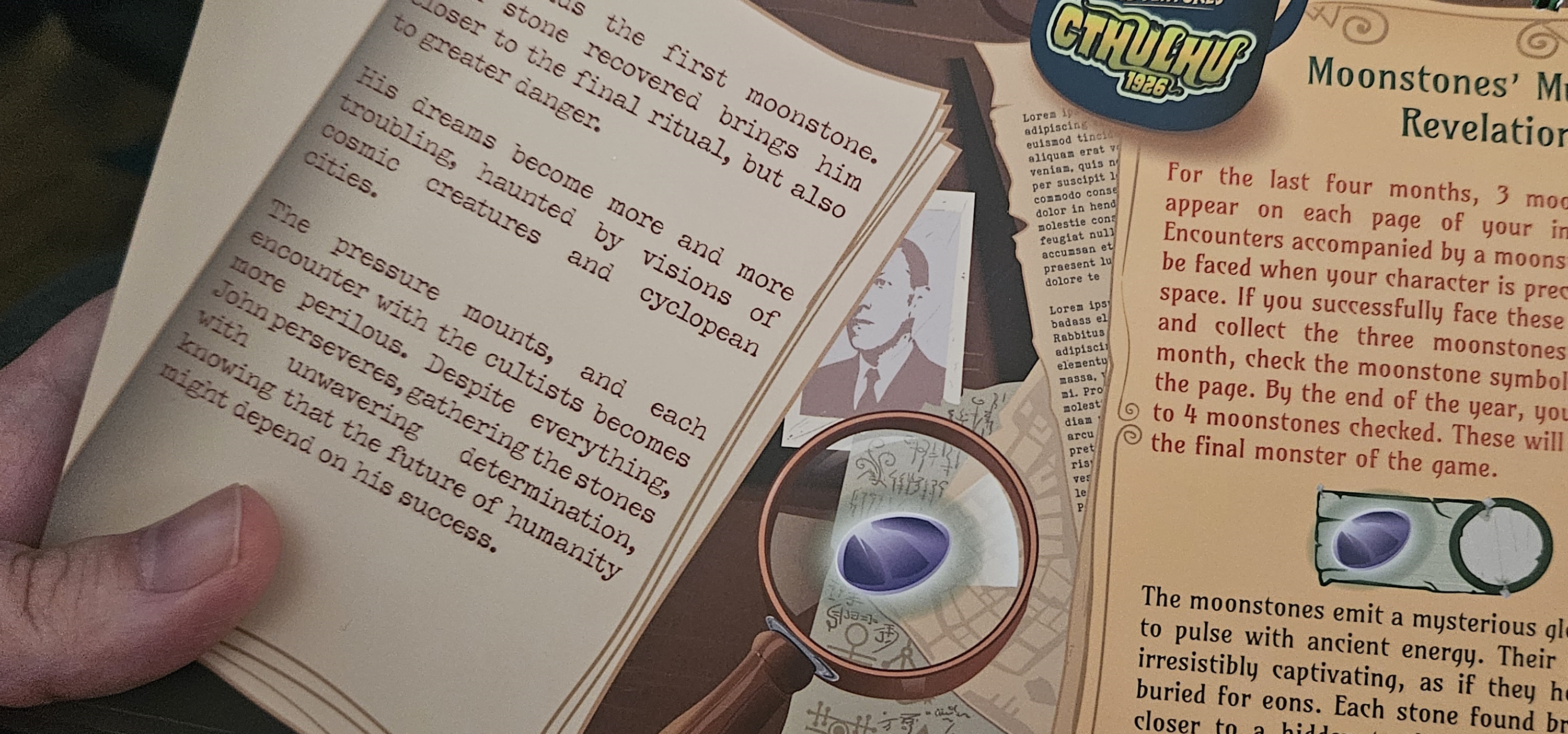 Later, you earn limited abilities, like reading a grimoire to turn Cthulhu dice into numbers, a librarian who can reduce your madness (with no way to track the reduction), or a Tommy Gun for doubling your roll. Fine. Other updates, though, commit such unforgivable errors as reducing your madness cap (boring), adding extra icons to certain challenges (further reducing the game’s wisps of press-your-luck), or asking you to secure little moonstones to make the final boss — the final final boss, not the normal final bosses — a little easier. Oh, and these moonstones are sort of hidden. Sort of. There’s nothing as interesting as hidden images or autostereograms in this game. Just little rocks that either you remember to notice or you don’t.