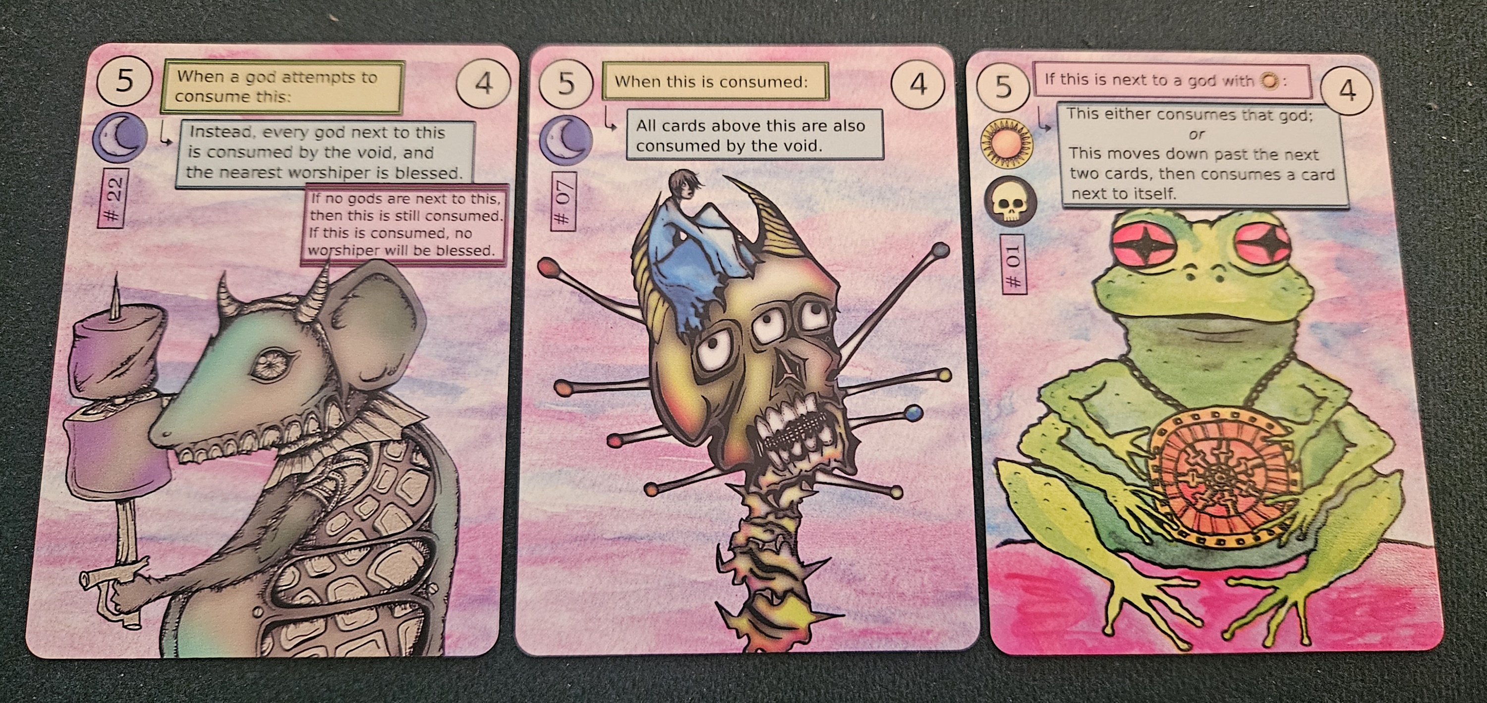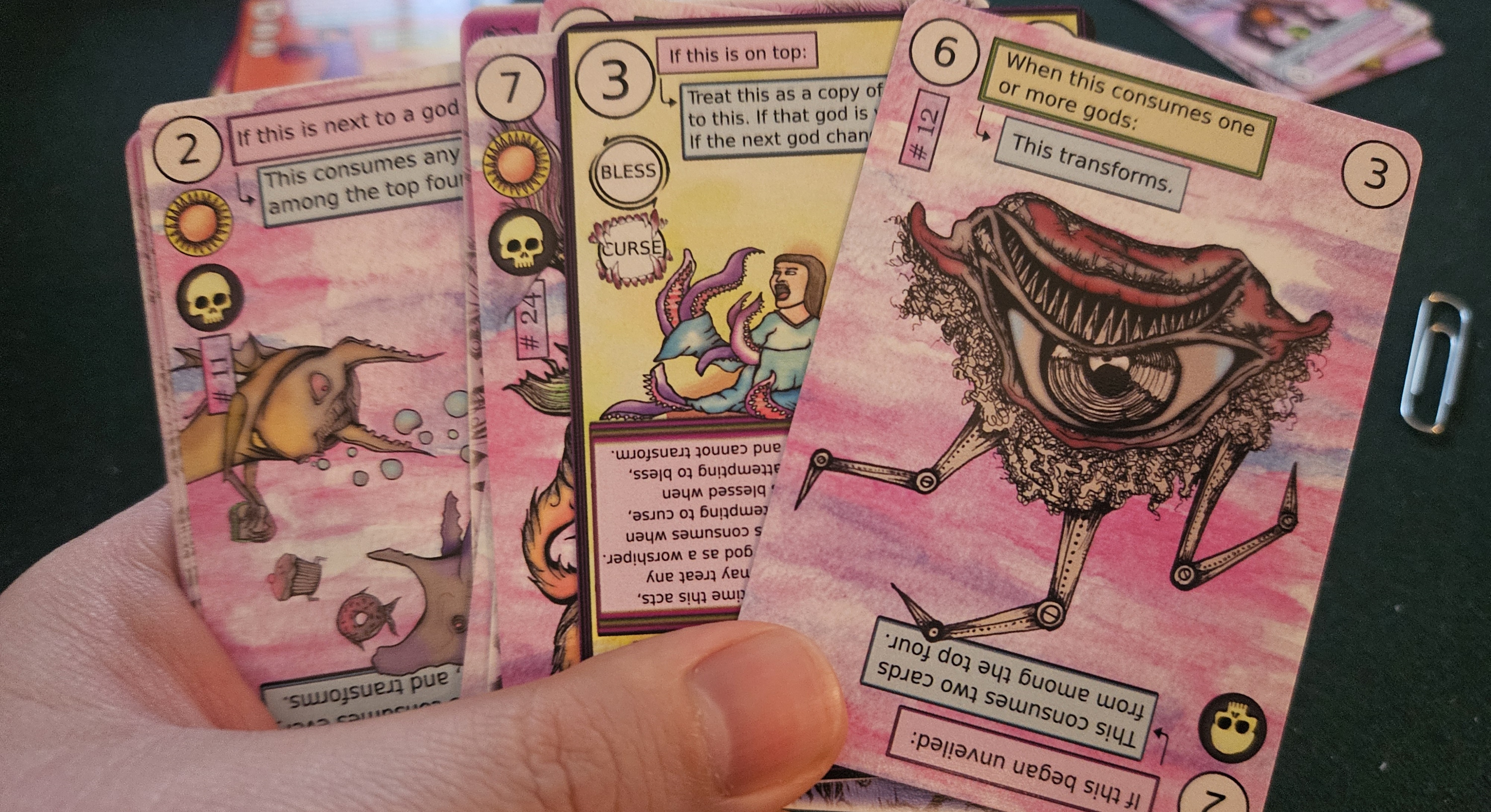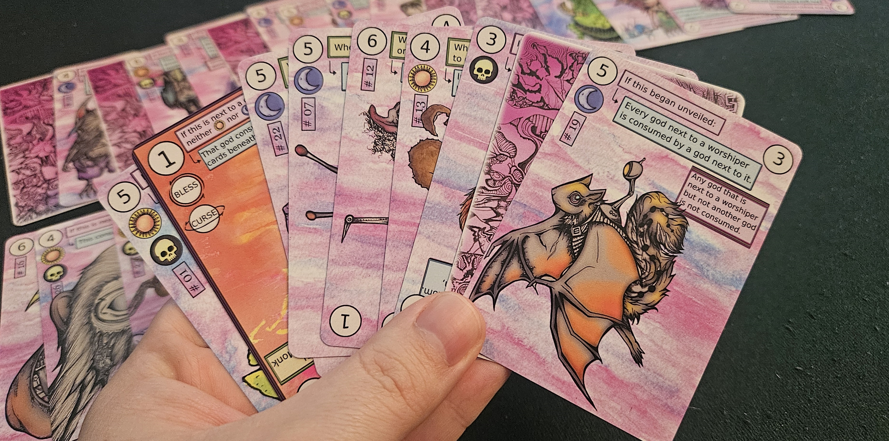 Of course, as with other deck-in-hand card games — I’m thinking of Palm Island or All Is Bomb here — the complexity of Monotheism doesn’t arise from the rules so much as the permutations of the deck itself. Your goal is to reduce this sprawling pantheon down to a single god while keeping at least one worshiper alive. The problem is that gods are only removed by being “consumed” by their fellow deities.