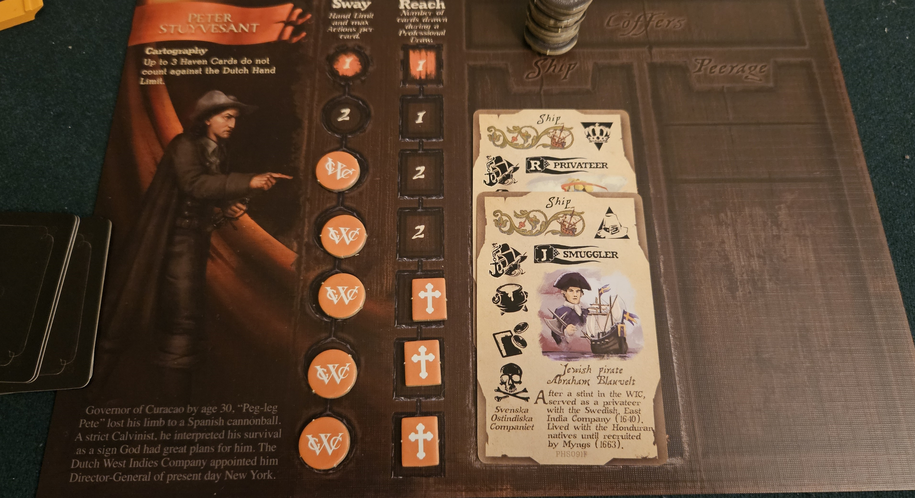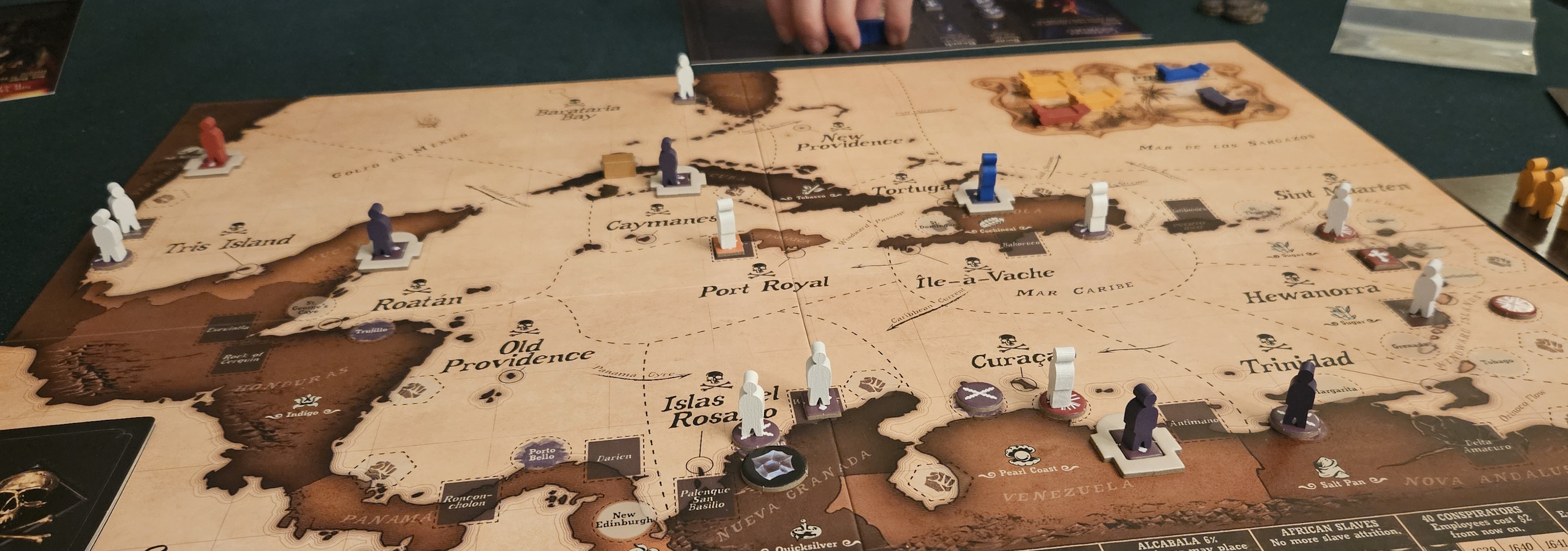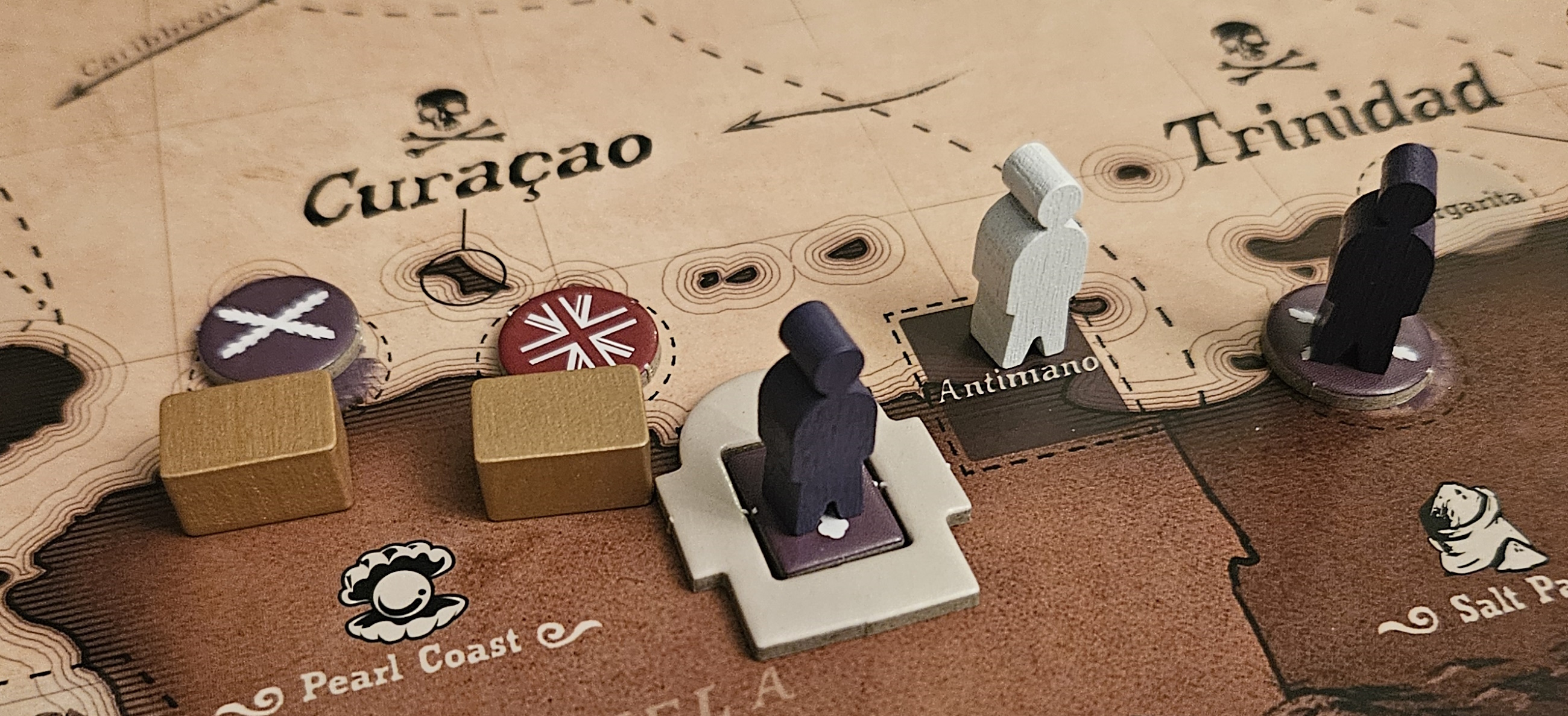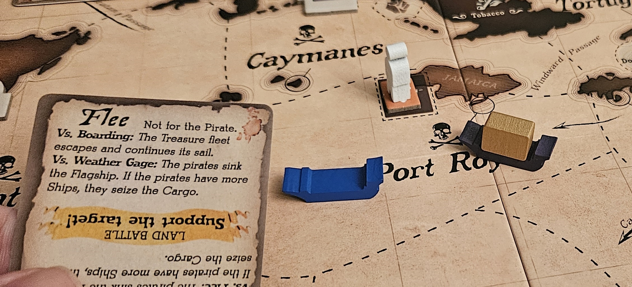 I won’t take up your entire day with examples. Instead, I’ll offer only one: the sailing phase. This is simultaneously the game’s most amusing and most confounding portion, asking players to buzz their flota from one sector of the Spanish Main to the next like a kid going brrrr with a toy motorboat. You move your ships into the Caribbean, load up cargo or kidnap slaves or whatnot, and then creep across the map, pausing in each space so that other players have the chance to play a card that will interdict your fleet. “Curaçao… Port Royal… Roatán… Tris Island…”