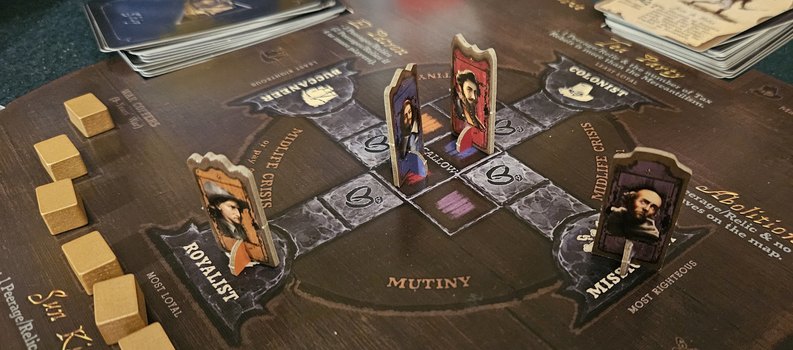 Note that this isn’t always useful. Cards do the usual Pax things, triggering actions and adding pieces to the board, so you always run the risk of drawing something that doesn’t quite gel with your plans. But they also nudge your position on the ideological compass. If played in the right sequence, it’s possible to crawl forward along your chosen profession until you become an extremist and therefore eligible to win. Along the way, though, it’s possible to step off to the side of your chosen track, effectively walking the plank of your own ambitions. This can result in a mutiny — becoming an abolitionist on a slave ship is a dangerous affair — or a midlife crisis. That latter outcome is considerably less dangerous, since you can assuage your doubts by buying a fancy carriage. But in either case, falling off your profession track boots you back down to the middle of the compass, callow all over again. It’s the Pax equivalent of moving back into your college dorm after getting laid off from your previous job.