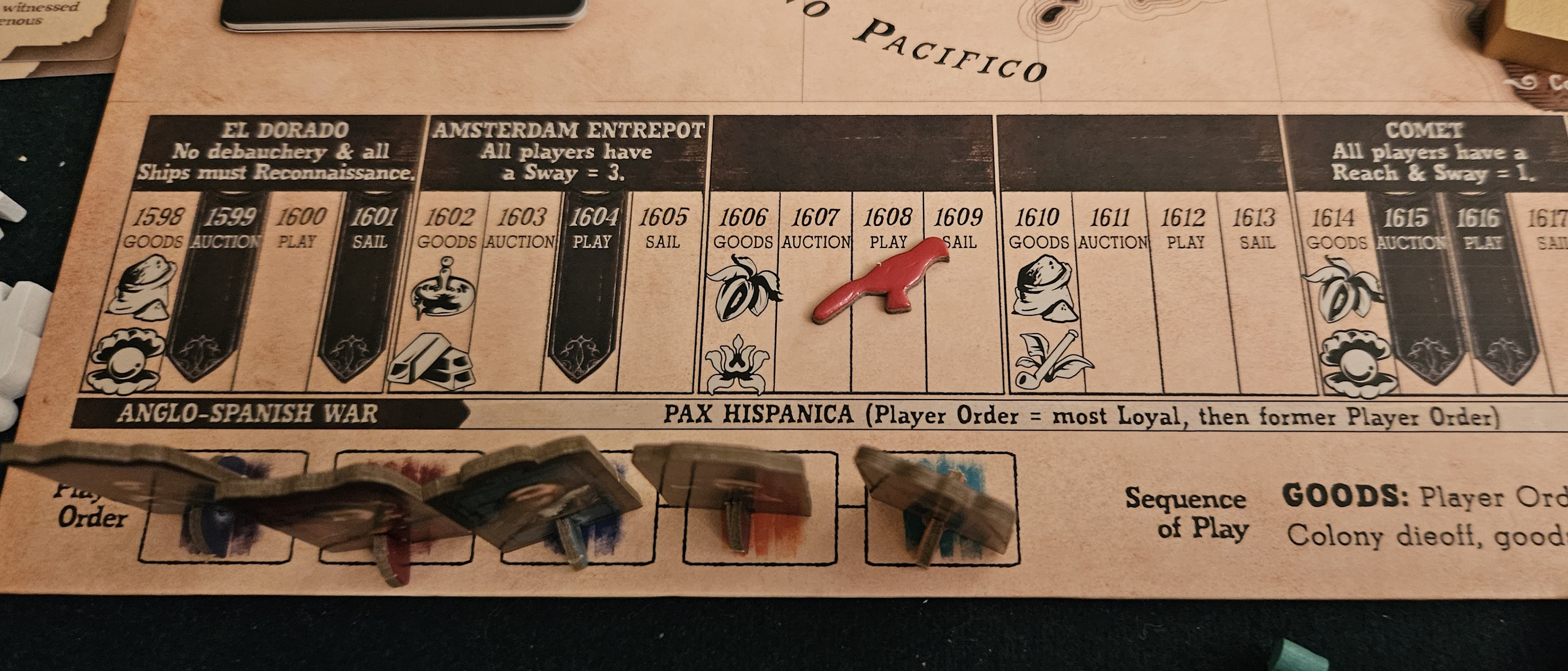 The passage of years, meanwhile, is strictly jacketed. In the earliest block, ships are limited to reconnaissance actions thanks to all those adventuring conquistadors. Later, the number of icons you can use on a card might be artificially inflated or nerfed. 1618-1621 are hurricane years, causing any interdicted fleets to be immediately sunk. Malaria rears its head, but only in 1626 and 1642. The Thirty Years’ War begins in 1618 and lasts the remainder of the game. Unlike other Paxes, which treated their flashpoints as moments when the future couldn’t be known in advance, Pax Hispanica proceeds in an orderly fashion through set events.