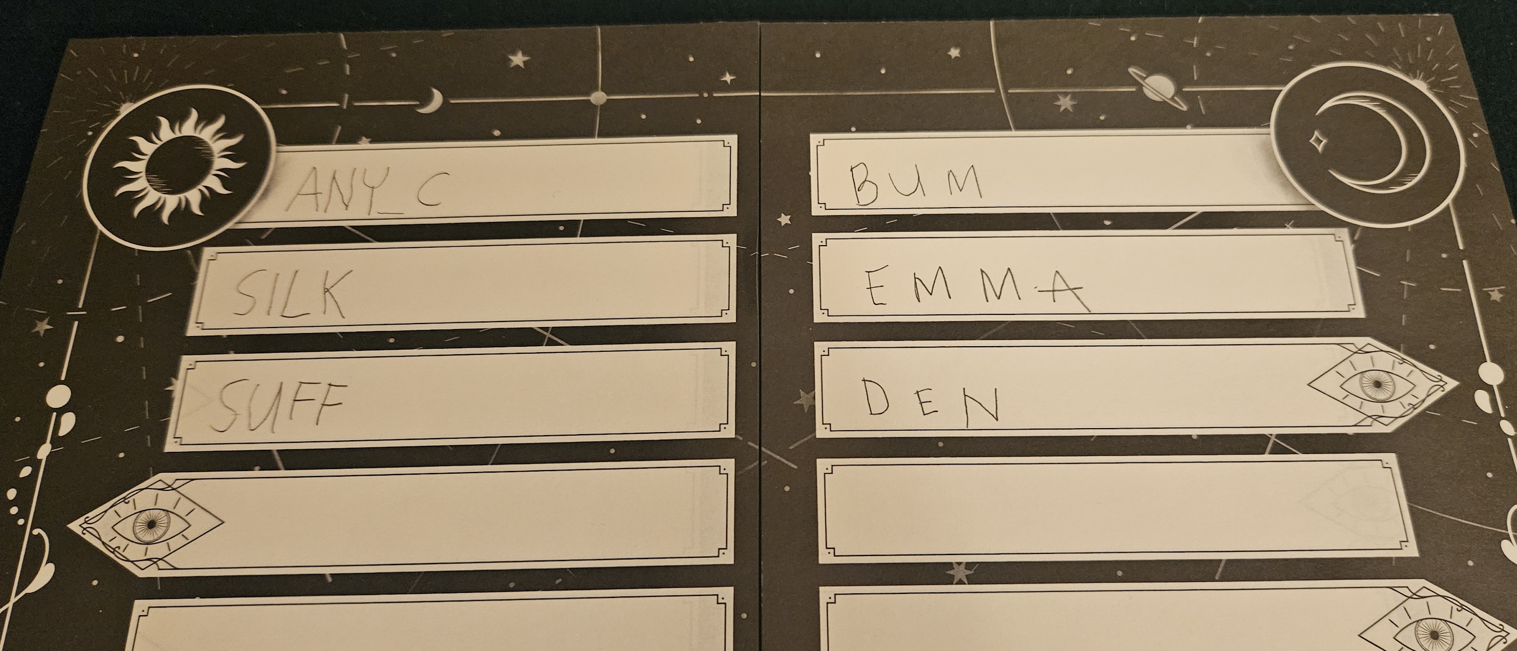 Okay, so somebody has died. Two somebodies. Lexical spirits, et cetera. Everybody else at the table is divided into two teams of competing mediums, one per spirit. Now these mediums will use the power of automatic writing (no, not really, but I think that’s what we’re doing in the game’s “background”) to decipher the word these spirits intend to communicate.