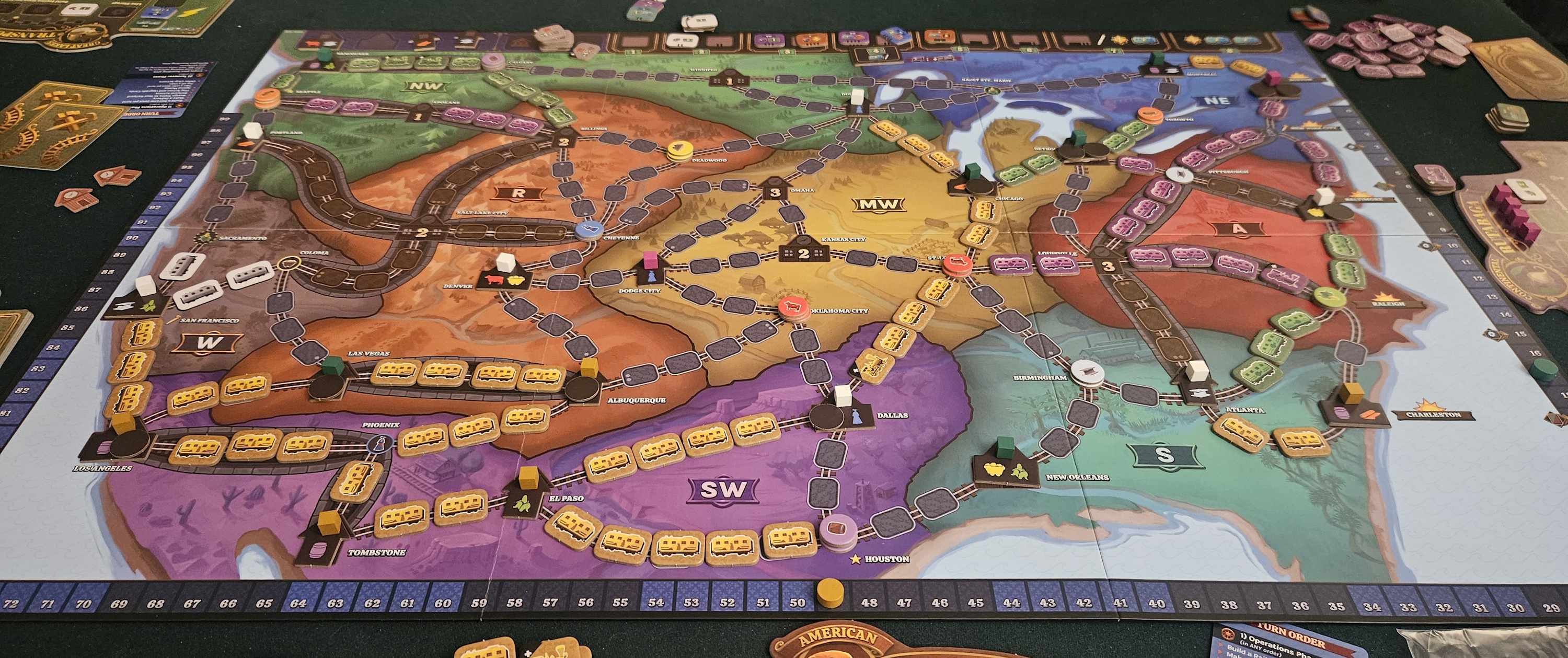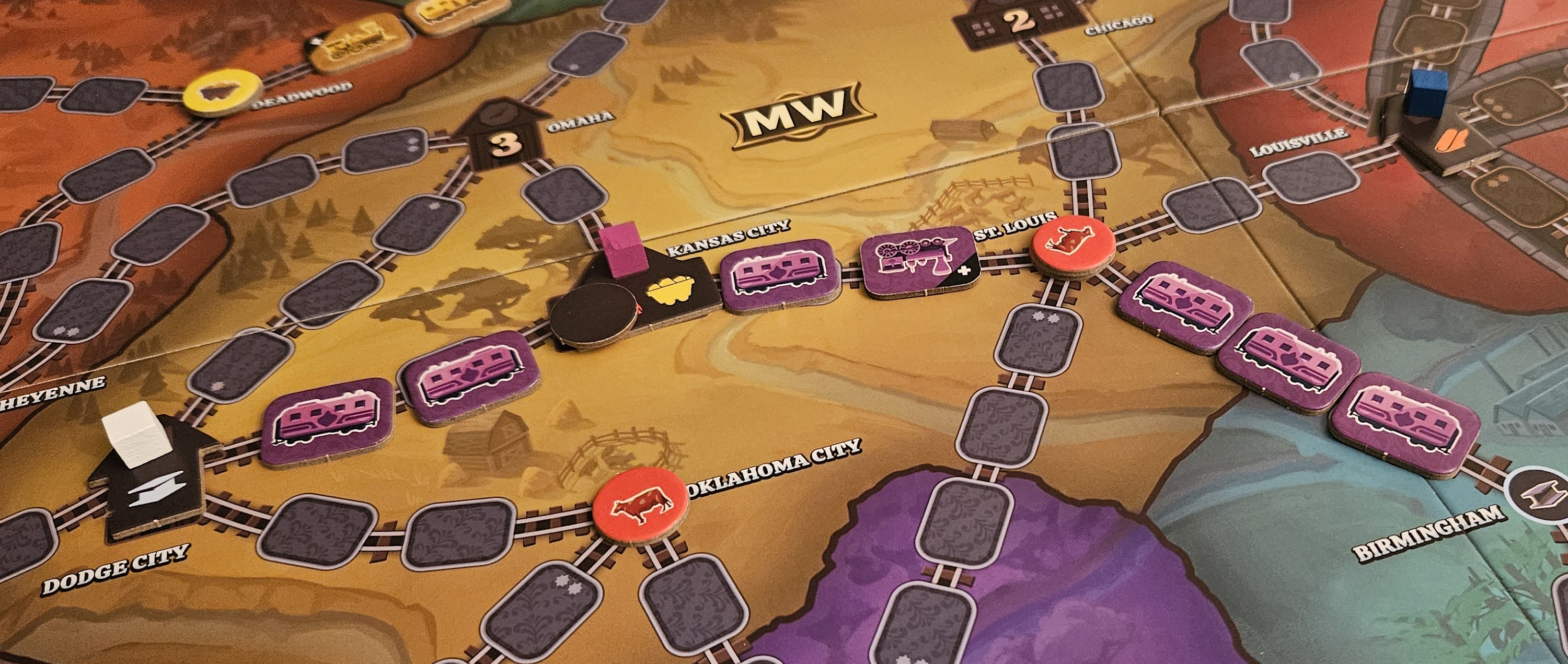 This system quickly establishes its own tempo. Early on, your boarding area clogs with those bland starting chits. A dollar here or there for buying new chits from the market. One or two railcars for early actions. Perhaps a contract, those color-coded chits that allow you to tap a region for one of your lines or stations.