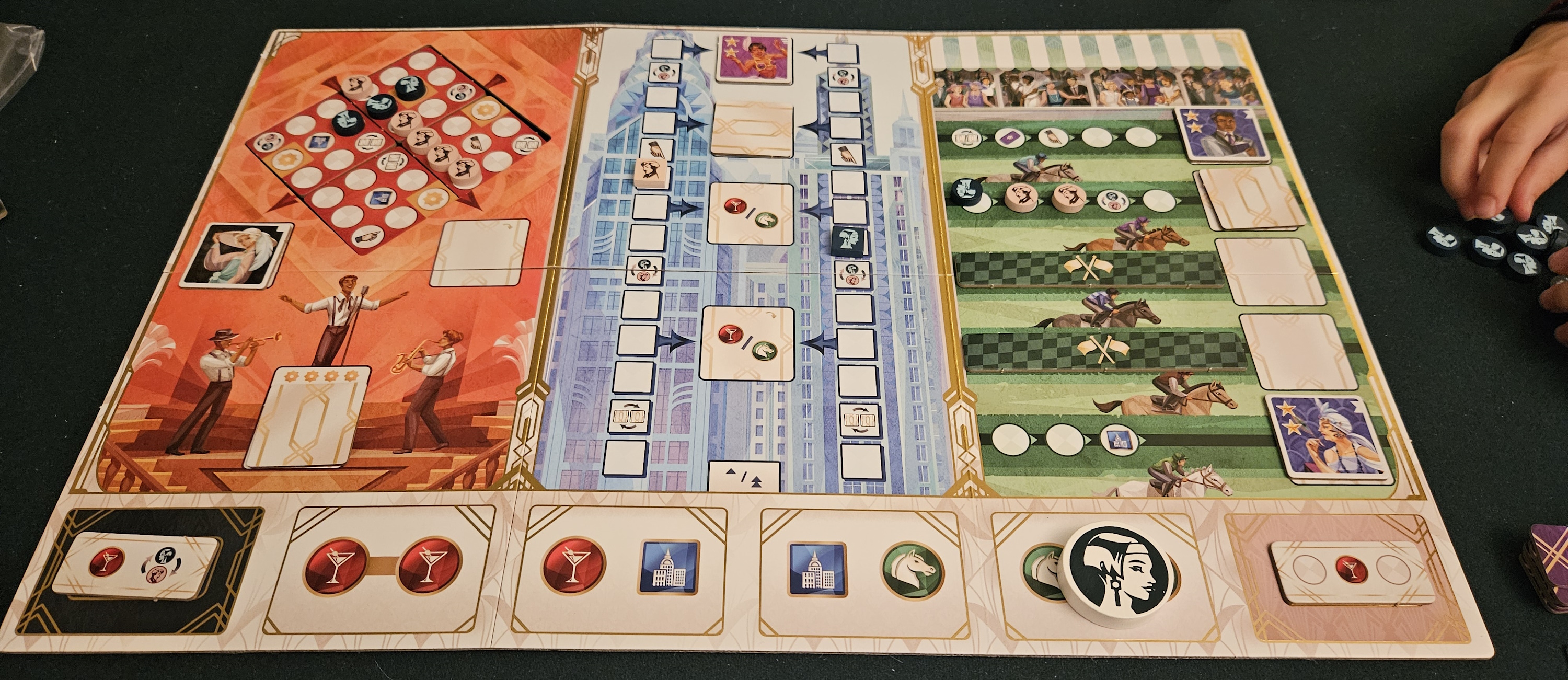 Meanwhile, there are ample opportunities to trigger combos. By placing a token in the club, maybe you’ll earn a bonus in the high-rise, which will let you swap out some tokens to seize the advantage at a horse race, which you can then capture by catching up to your opponent on your next action in the high-rise, stealing the race out from under them. Each contest feeds back into each other.