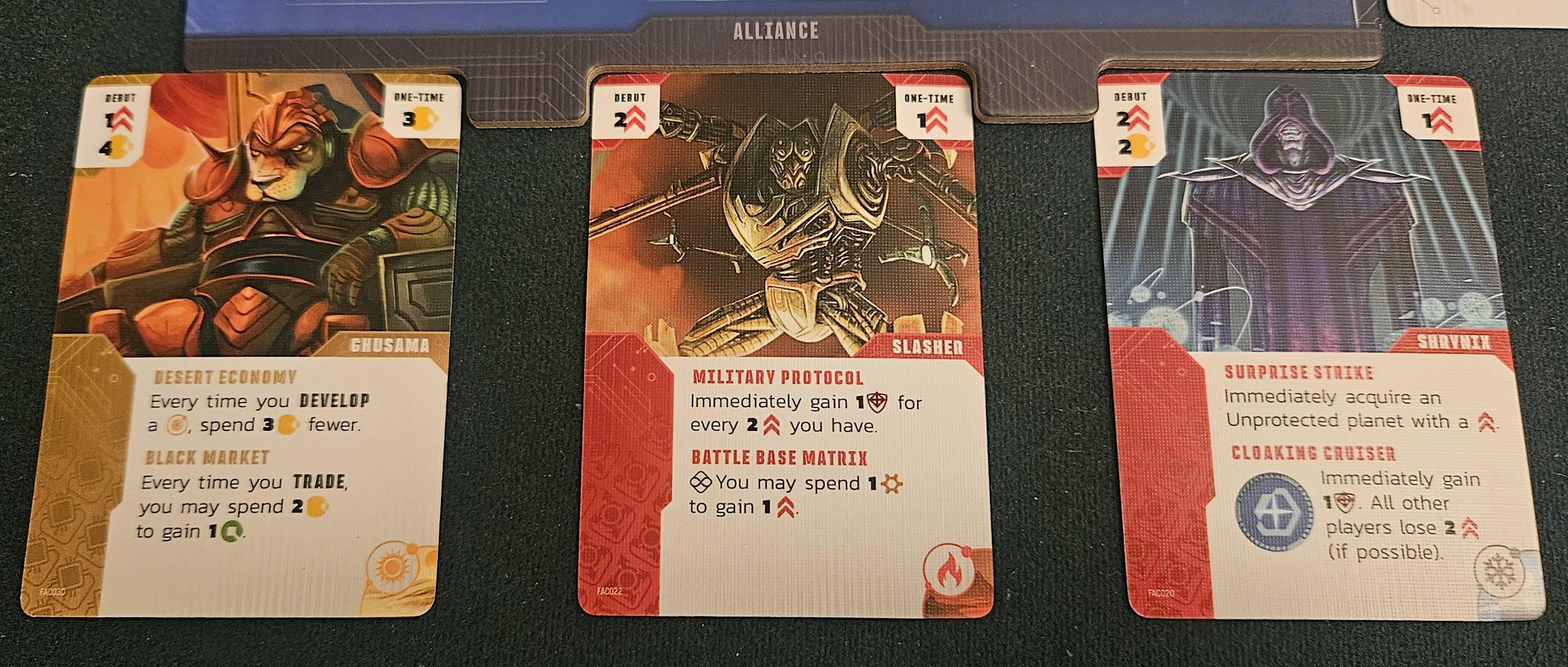 Except maybe your Sojourners are having trouble with another player’s space bullies and cash illiquidity. In that case, maybe it would be better to round out your alliance with the Bjordolf, space-bears whose ample ships and wartime economy will keep your enemies at bay and the credits flowing. Or the Dhafizah, space-saigas that make it cheaper to retrieve those relics. They won’t handle the enemy spaceships, but since you’re buying relics anyway… Then again, there’s the Mobesus, space-mobsters who can trade away those relics on the black market for wads of cash. This will reduce your innate synergy for relics, but maybe you can churn those credits into a new source of points.