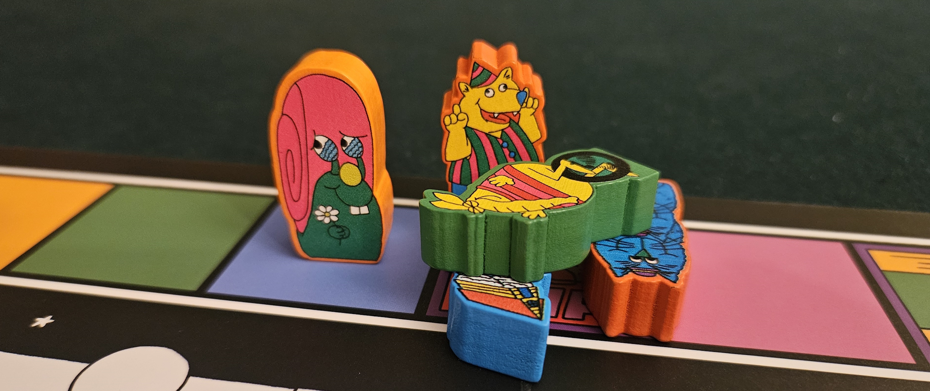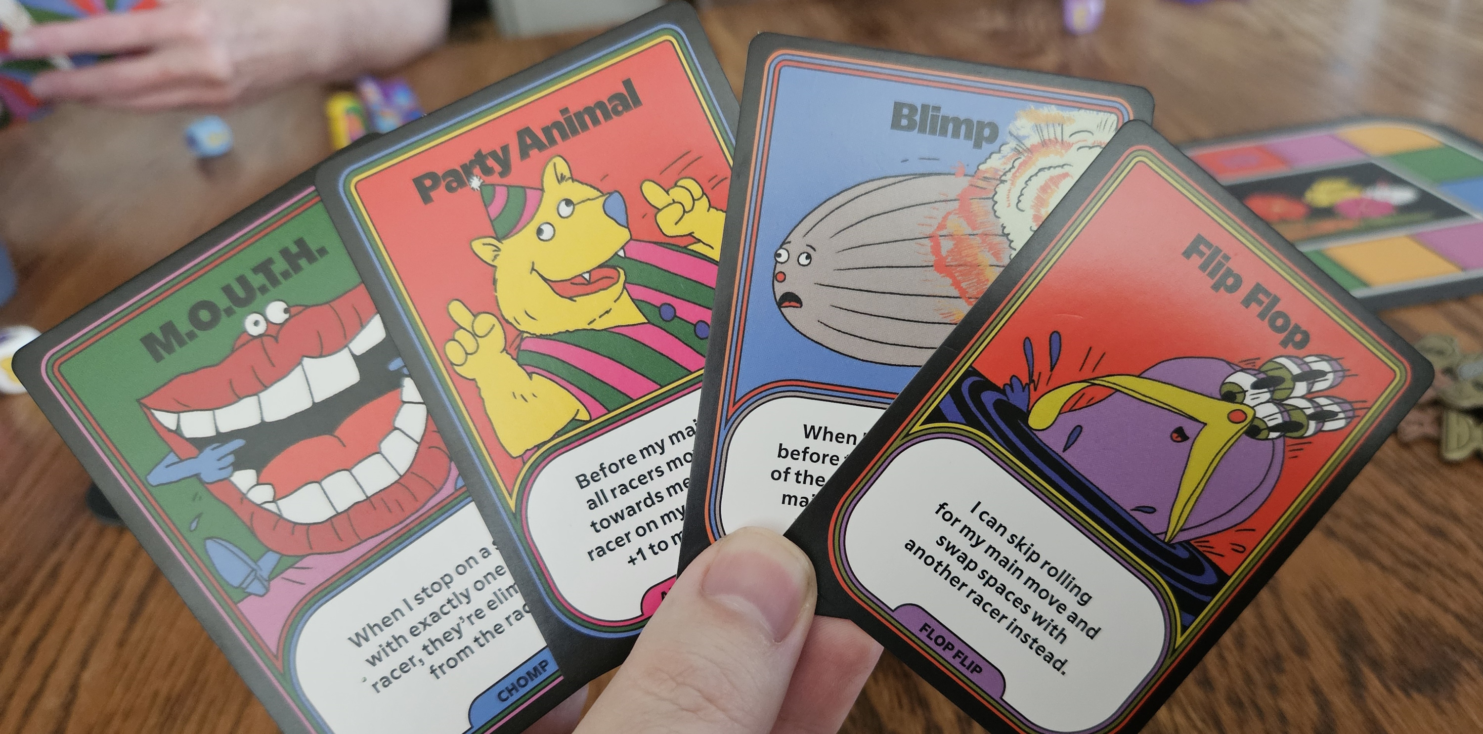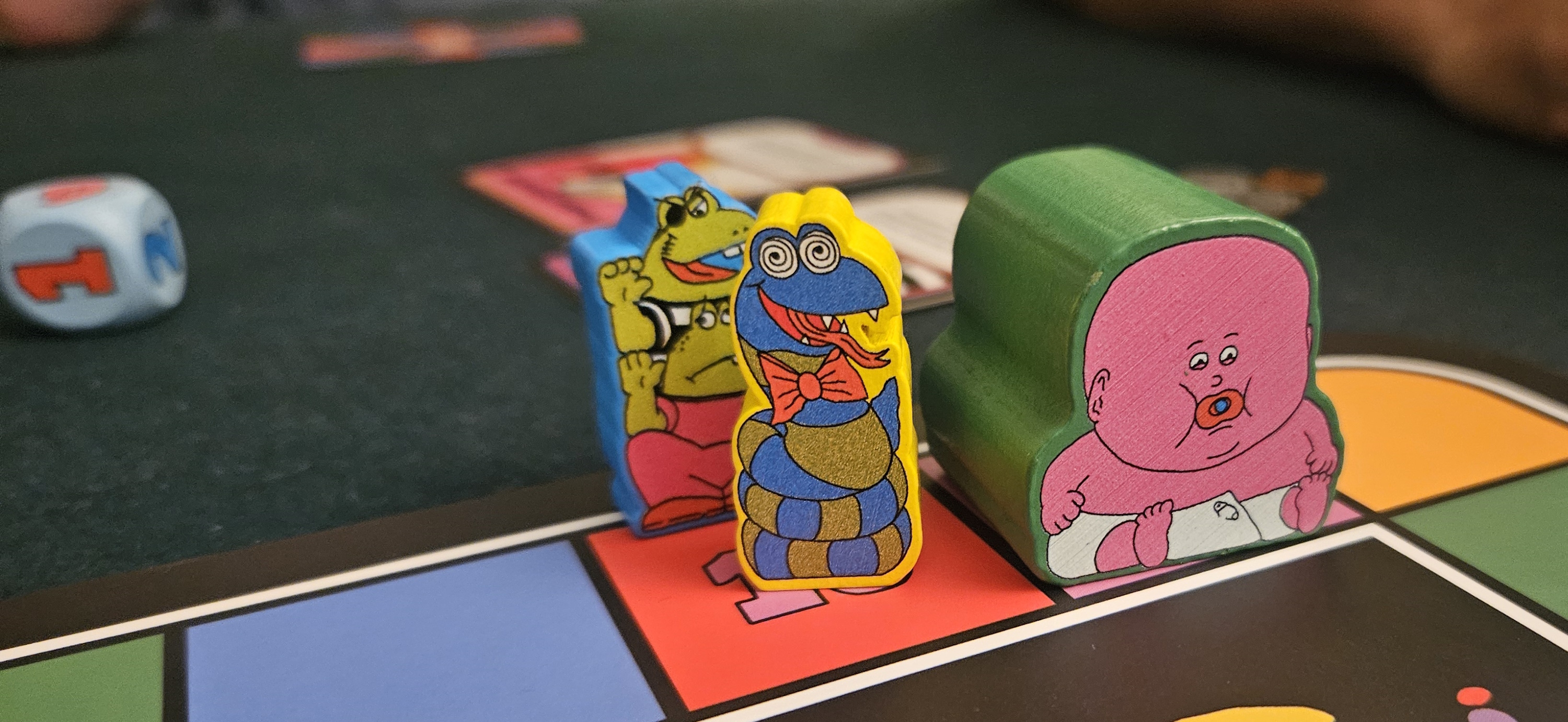 Or there’s the Hypnotist, who warps another racer to its space. Or the Suckerfish, who attaches itself to another racer. Or the Lovable Loser, who earns points for sitting in dead last. Or Scoocher, who scooches forward a single space whenever another player’s power happens — perfect for those matches when powers are triggering left and right, not so great when paired with occasional contenders like Heckler (moves a couple spaces when somebody barely moves) or Skipper (goes next in turn order when somebody rolls a 1) or Twin (steals the ability of a previous winner).