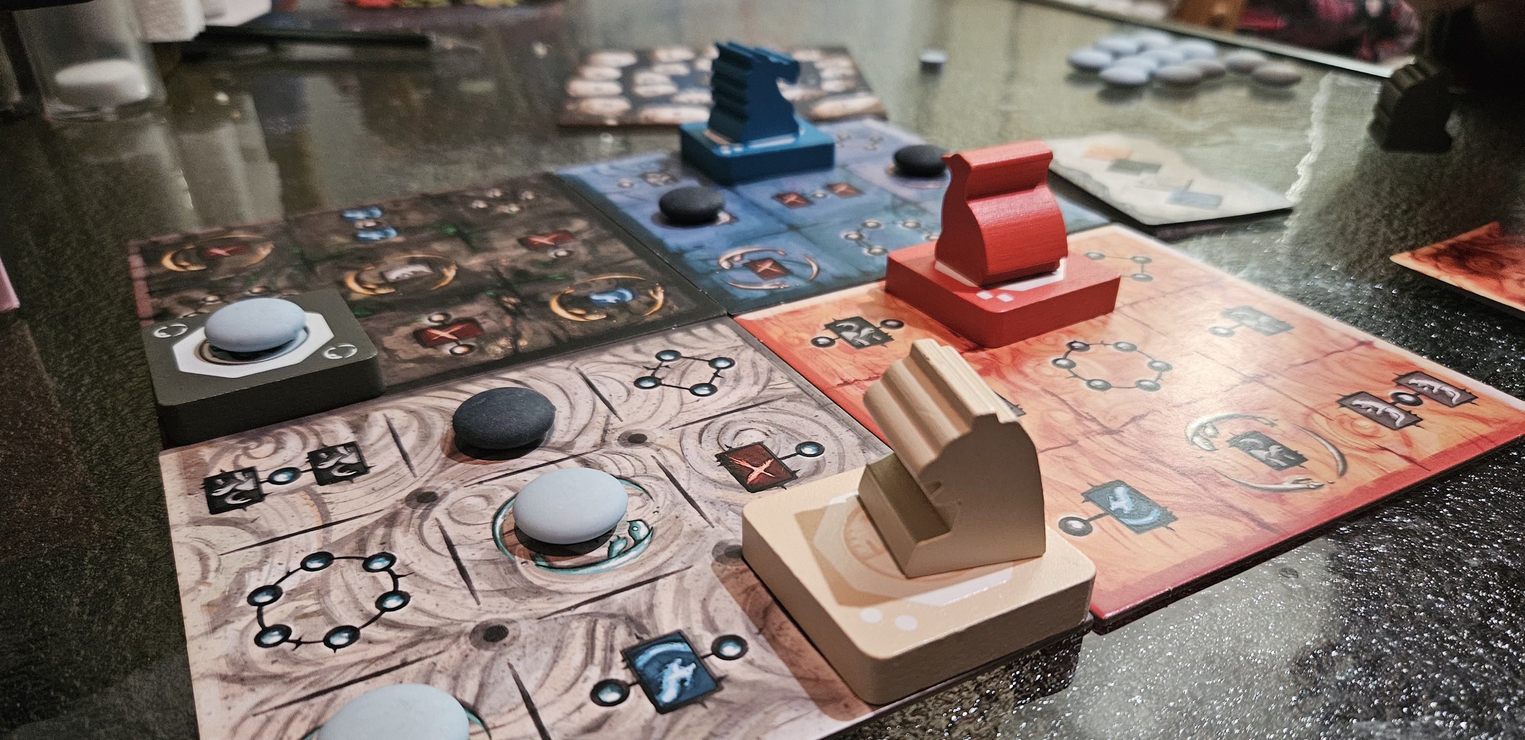 Hence, in the long tradition of many abstracts, it isn’t enough to place stones that forward some objective. Stones ought to instead further two or three objectives at the same time. You’re playing offense and defense at the same time, and hopefully claiming the right Auspicious Beasts, and keeping a mental tally on your rival’s card count, and assessing discounts along those leylines, and also, sometimes, if you’re playing with the optional boards that are included in the deluxe edition, attempting to pull off an alternate win condition.
