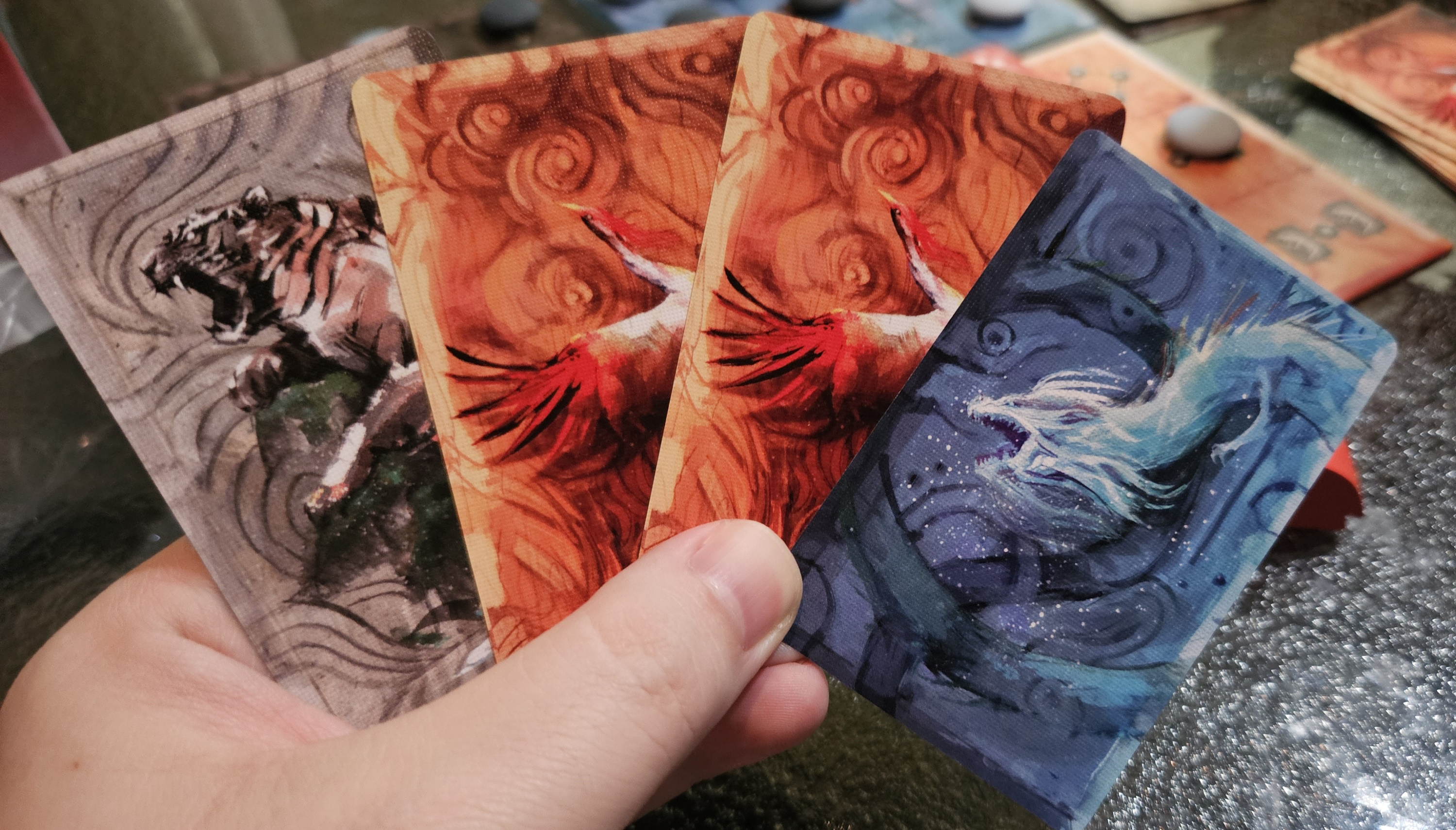 These are important because each creature has their own means of appeasement and provides their own reward. The simplest of the two, the Azure Dragon and the White Tiger, are awarded to whomever places two stones in their row/column, and provide either three or two wisdom respectively. The Black Tortoise is a little trickier, favoring the player who places their stones on the board’s scattered ring-looking spaces; when claimed, the Tortoise allows its owner to place a stone on its mountain, providing a nice discount without the usual blocking entailed by mountains. Finally, the Vermilion Bird is a homebody who favors those who place stones in its home realm. This lets you draw an extra pair of cards. Which, in case you missed it earlier, can be a surprisingly potent boon.