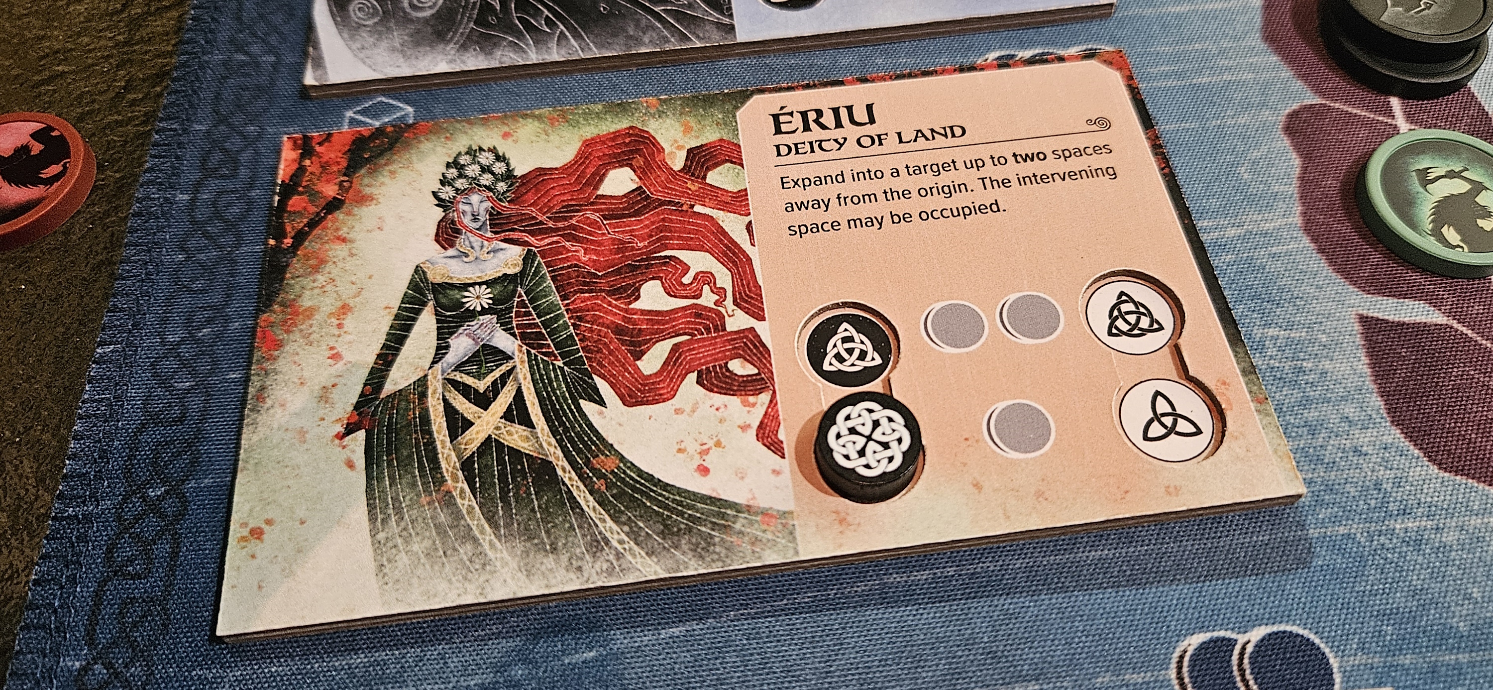 These twin problems dictate everything going forward. Every action matters, and doubly so because most will only let you expand into a single space. Actions are selected by currying favor with the local deities. These are all similar enough in practice, letting you raise a few armies and send them off across the countryside to slay your foes and claim territory, but they differ in the details. Ériu, the matron goddess herself, lets you skip an intervening space, potentially bisecting a tribe’s territory or skipping past a massed army. Boand lets you travel even farther, but only if you stick to coasts and lakes. Morrigan pitches in by killing some adjacent monsters, making your expansion all the easier. Every god is worthwhile, but they become even more desirable as you invest tokens to upgrade their favor. Early on, you’ll be lucky to wring three armies out of an action. By the game’s crescendo, tactical investments may have doubled that amount.