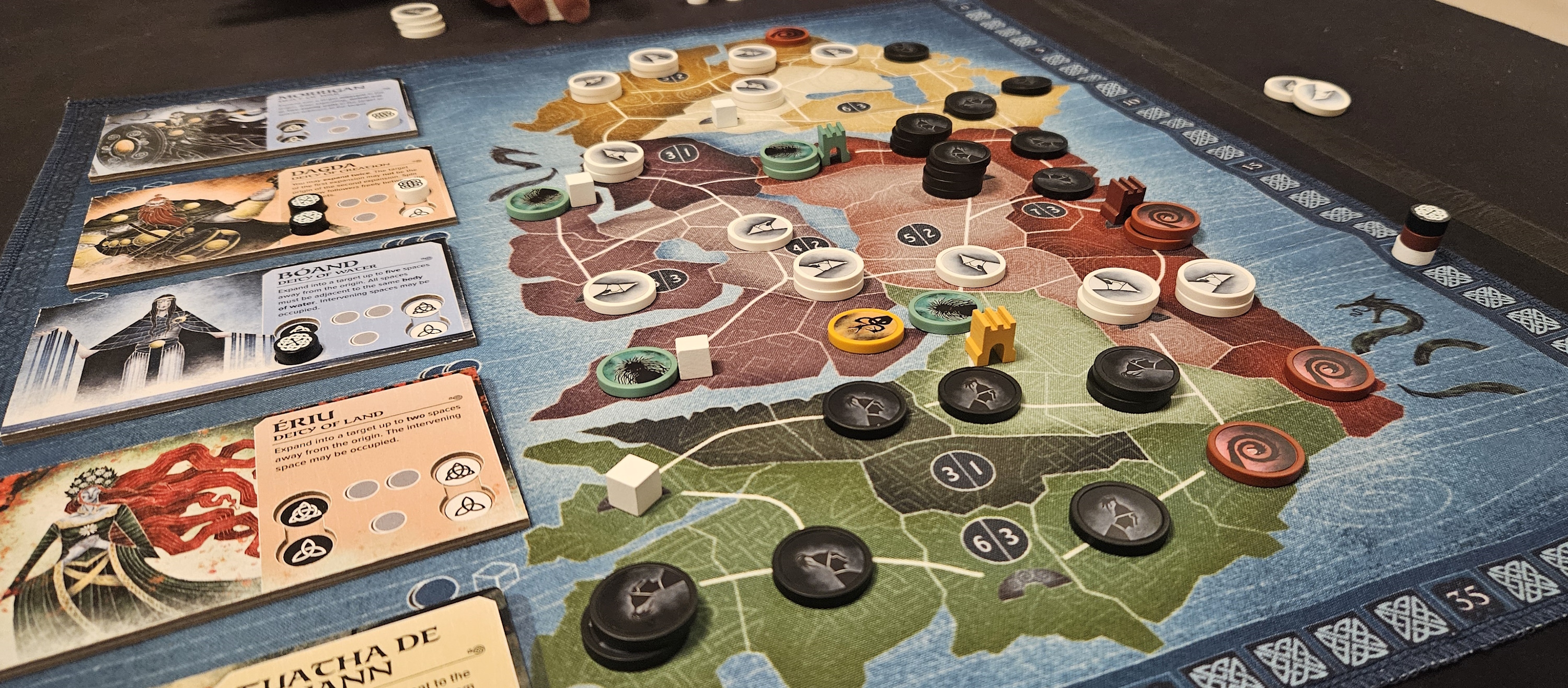 I’ll confess it was a little surprising to unfurl Moytura’s board and see such a literal depiction of Ireland. After the suffocating hoplite melee of Iliad, the checkerboard Mount Olympus of Ichor, and the abstract leylines of Azure, here the membrane between the real and the mythological seems especially thin. Designed by one of the busiest partnerships in the industry, David Thompson and Trevor Benjamin, and fiercely illustrated by A. Giroux and Harry Conway, Moytura loosely retells the Maighe Tuireadh’s ancient clash between men and monsters to decide the fate of pre-Christian Ireland. As an installment in this particular series, it’s something of an odd duck. I’d even go as far as to play loose with some definitions and label it a light wargame.