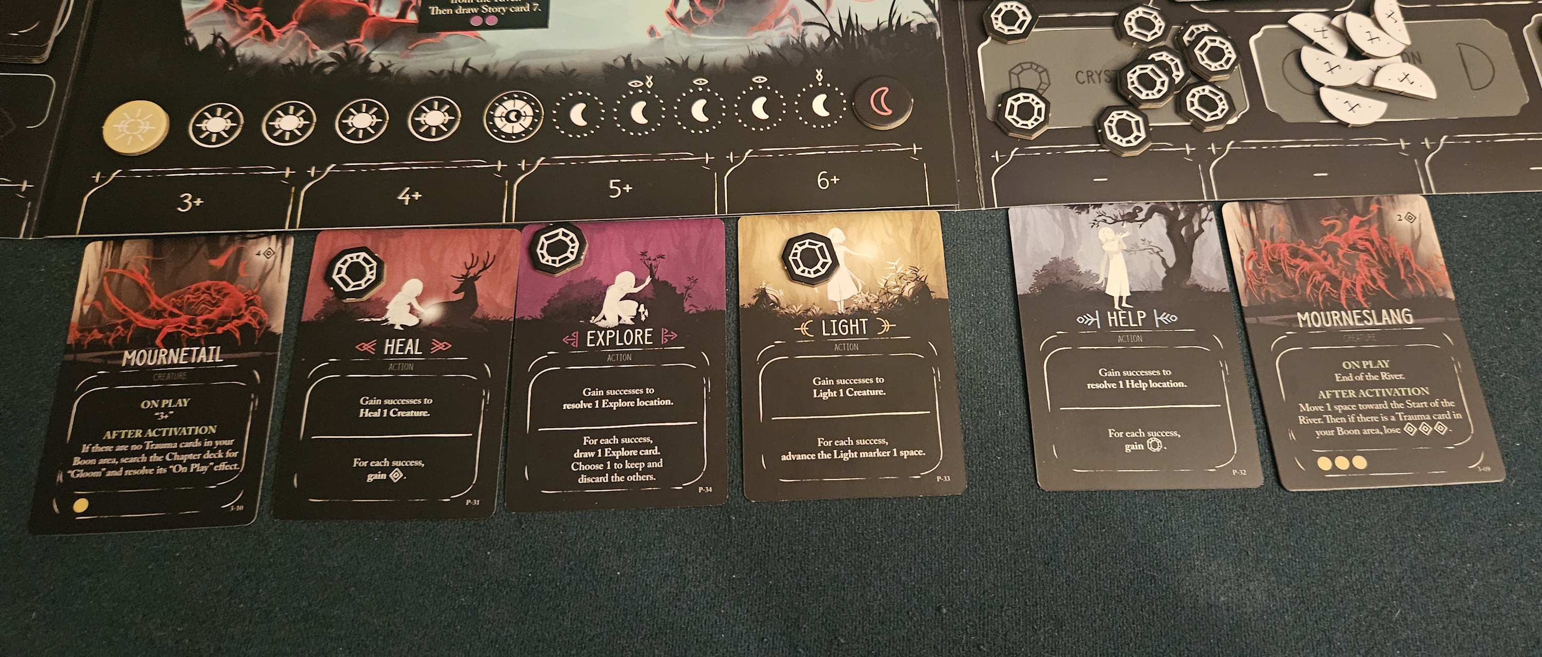 What really makes this system shine, though, is the other half of Storyfold’s formula. Luma’s actions are bound to four cards. By extension, the odds of their success are tied to their relative position. This takes the push-your-luck element of the game and connects it to a hand management puzzle. You might, for example, want to heal a monster’s traumas so that it leaves you alone. But your heal action happens to be situated a little farther along your card track, with rolls that only succeed if you hit 6 or higher. Not great.