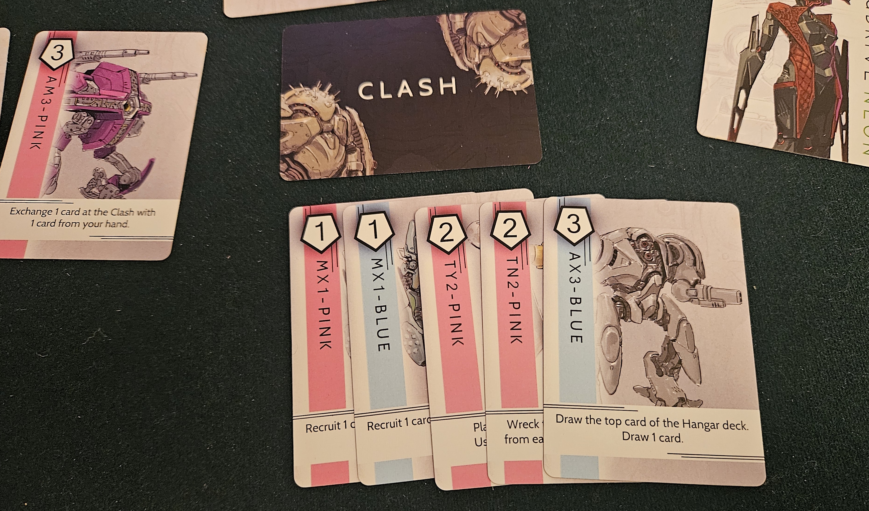Even here, Clowdus adds in his signature flashpoints, decisions in miniature that seem unimportant at first, but quickly reveal themselves as core to the entire experience. In this case, the decision is whether to draw until you have four cards — but doing so without the benefit of a shuffle, even should your deck be empty. Or you can shuffle your discard into your deck and draw three. This erases your discard pile and its ongoing overdrive abilities, but puts your used mechs back into circulation.