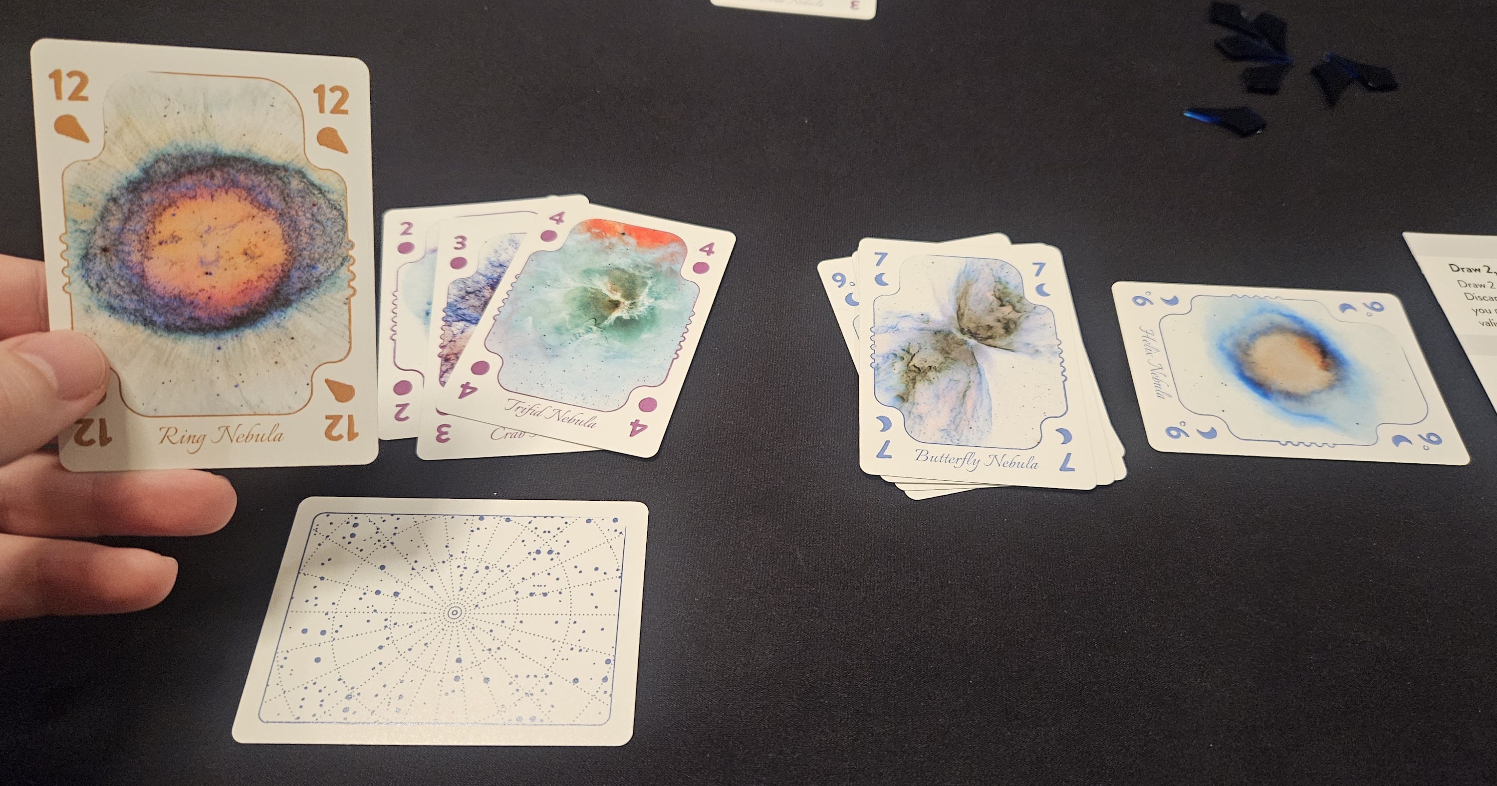 Except there’s so much going on under the hood. For one thing, the deck composition isn’t what you might expect. There are four suits. That might sound suspiciously like an ordinary deck of playing cards. Then realize the suits are ranked. The planet suit consists of cards from 1 to 5. The moon, 6 to 9. Comet? 10 to 12. Finally, the star is limited to a single rank, 13.