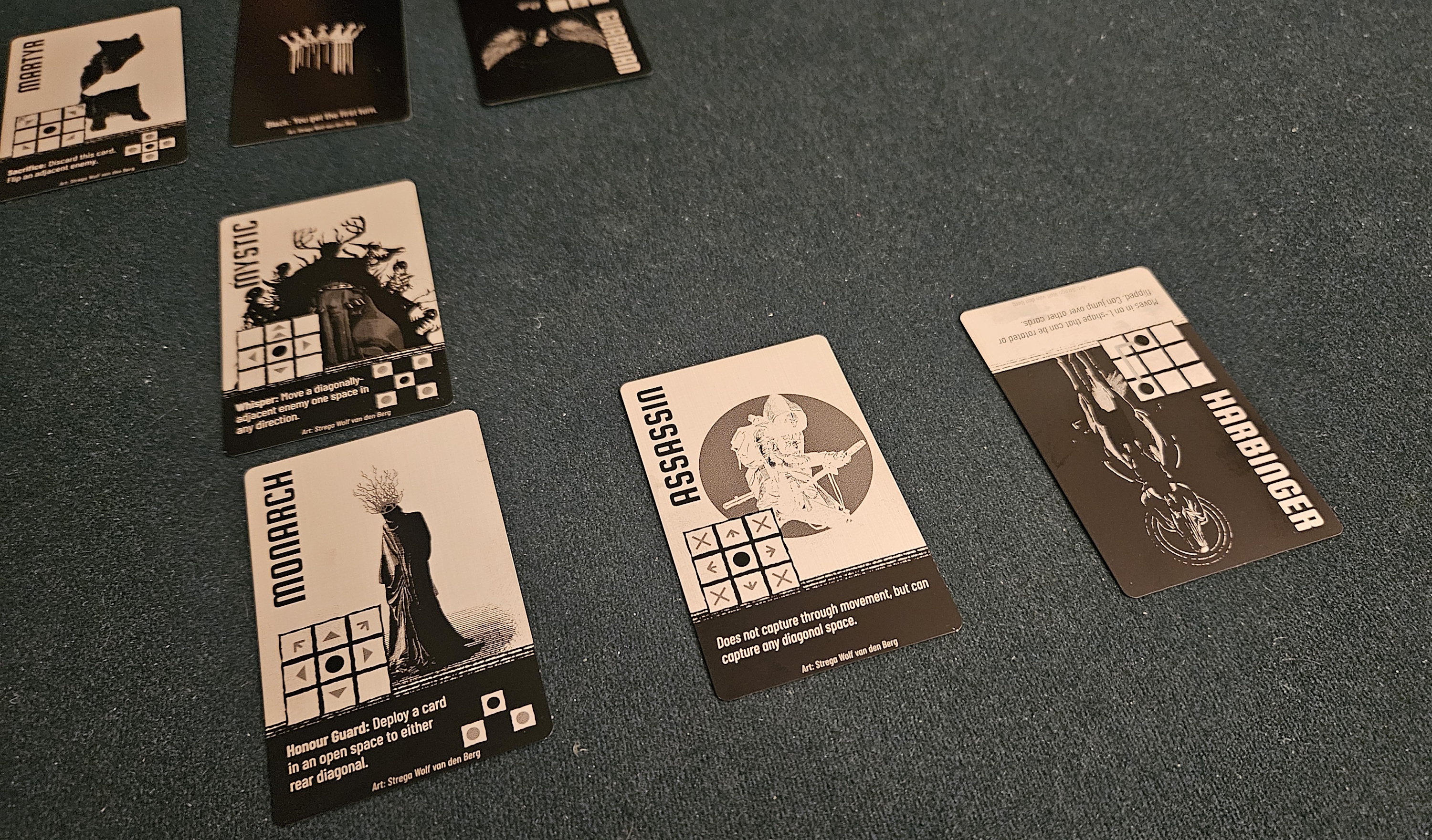 But in Berg’s own twist on the format, these units are madcap. There’s the Martyr, which can be removed from the board to flip an enemy card to your color. That would be overpowered in any other game. In Crownfell, where it fraternizes with the Labyrinth (locks neighboring enemy units), the Stag (deploys cards to additional spaces), and the Revenant (parks atop another card to lock it in place forever), the Martyr is one game-breaking beast among many.