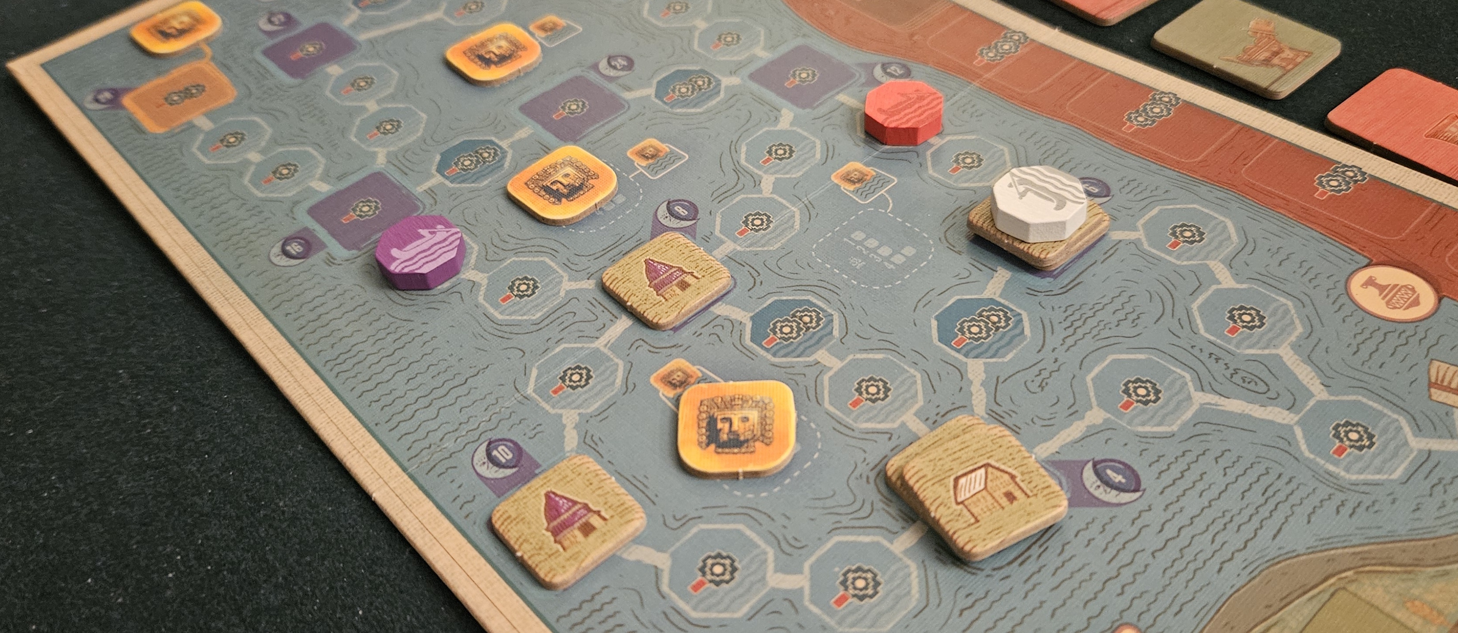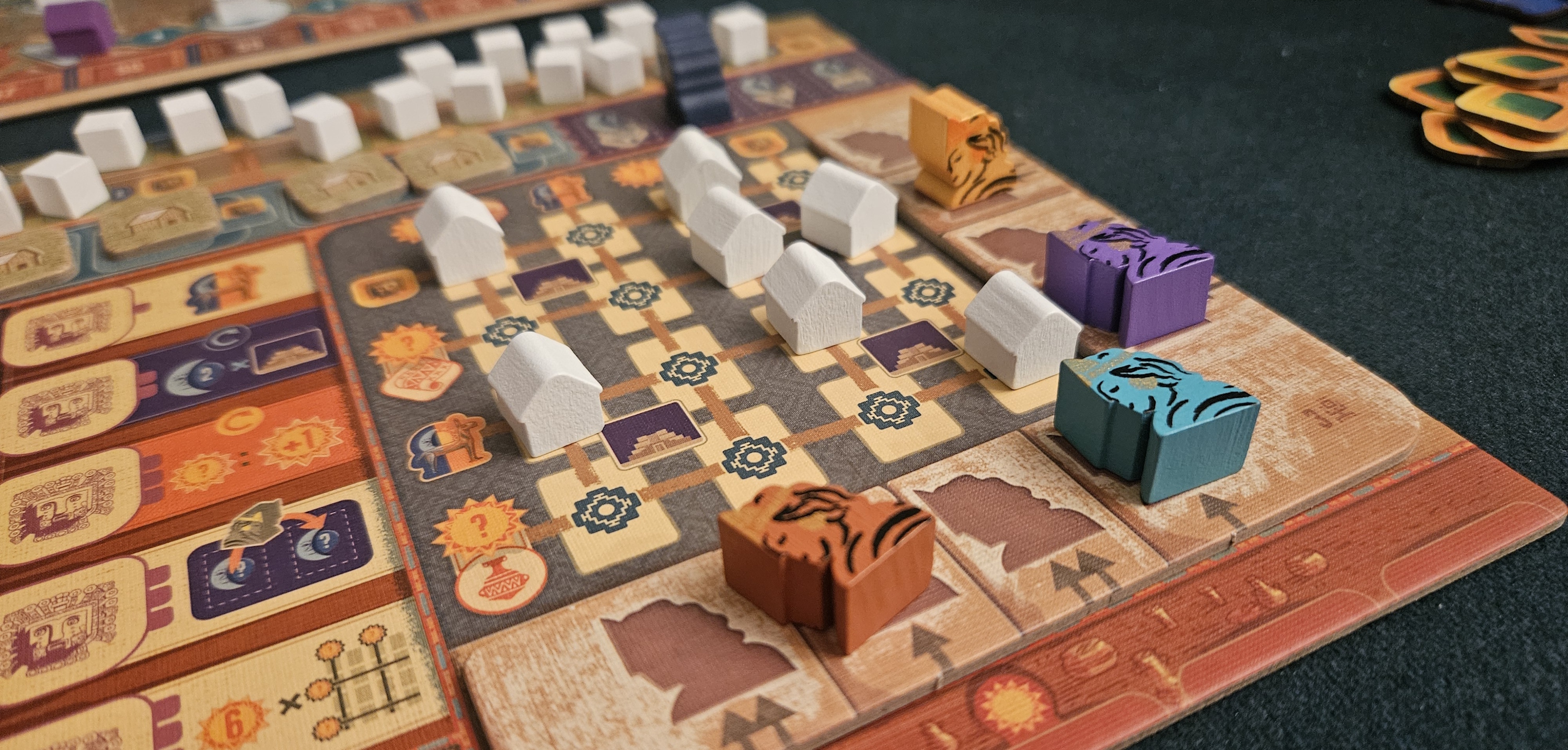Meanwhile, the board gradually narrows its scope. As those traveling ayar spread across the land, some fall behind and retire from the board — and therefore from players’ action grids. It’s a clever piece of design, decreasing the number of actions everybody takes in later rounds even as the efficacy of those actions grows more powerful. In the first round, you’re taking five wimpy actions. By the fourth and final round you only get two, but both of them are liable to swing for the fences. It’s a tidy way to keep later rounds from bloating, and rewards good planning to boot.