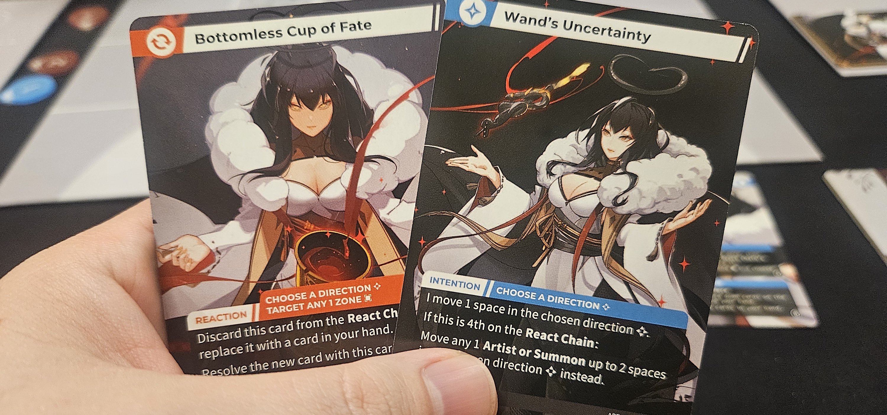 Nay, to Re;ACT! Reaction cards are added and then resolve on a last-in first-out basis. There are nuances aplenty to this system. If my Dancer intends to slug your Tattooist in the nose, this means you have a chance to dart out of the way. Except, aha, maybe I’ll add an attack card after your move card, which means it will resolve before you can slip away. But then your reaction to my reaction steps a summon into the gap to absorb the shot. And so forth.