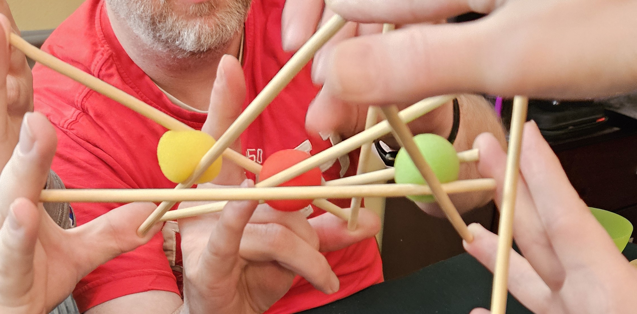 Early on, this is a simple ask. Two people can hold a stick between them. No problemo. Kein problem. Mondainai. Another stick? Sure. How about a third. What is this, a game for children?