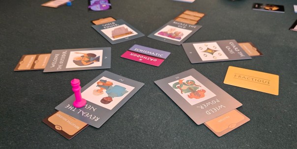 As a board game, it’s rather plain. The entire thing lasts maybe an hour and a half, give or take a few minutes depending how stridently people decide to chase their individual objectives. I mentally sort it into the same box as Jenna Felli’s deduction games, especially Bemused, where the incentives are opaque enough that newcomers are often left unsure of what they’re actually meant to do here. One can attempt deduction, trying to suss out what their fellow players hope to accomplish, but those energies are better spent elsewhere. At root, it’s about shifting stacks of cards from one place to another; beyond that, there simply isn’t enough scaffolding to produce much in the way of classic gameplay.