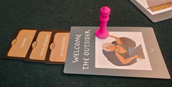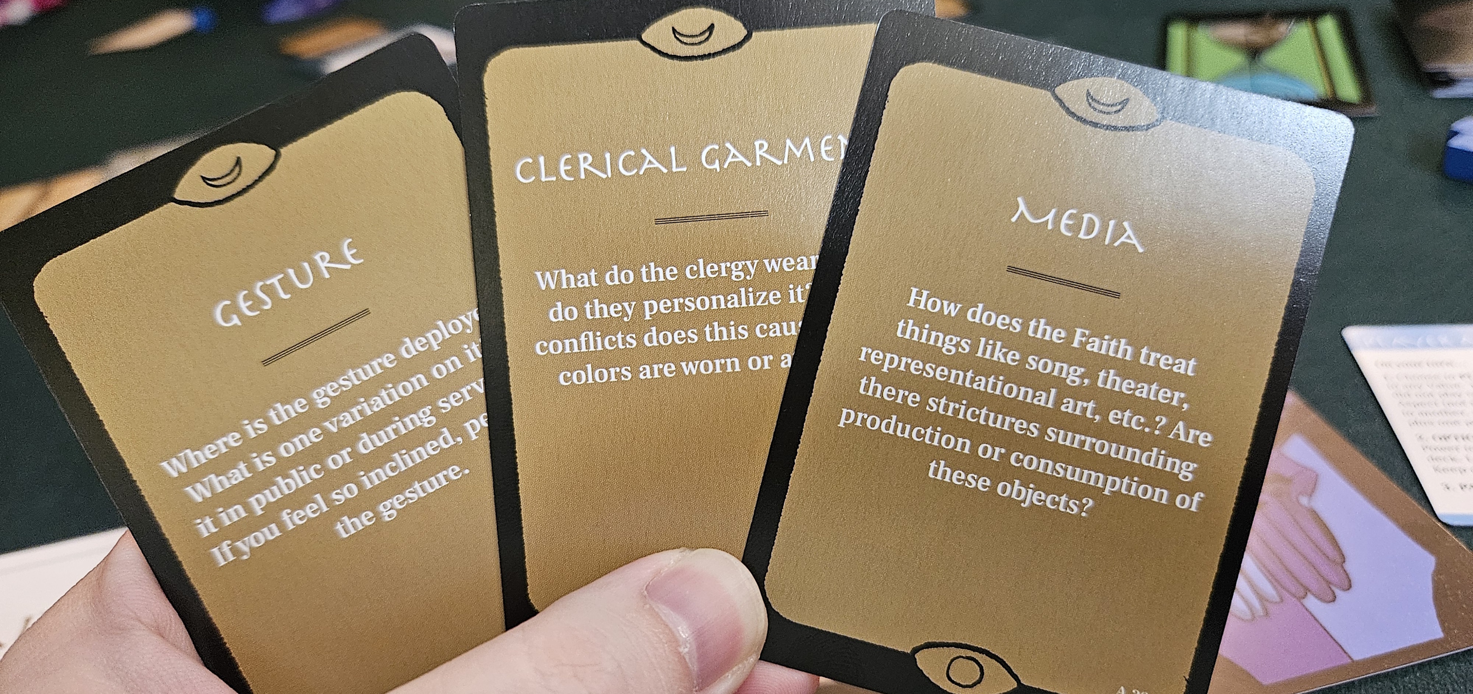 What’s interesting is that these objectives can be entirely complementary. There’s a world where my single-minded zeal and your spineless centrism go hand in hand. But what if one of our co-players is Rebellious? Their goal is to slap as many aspects onto non-dominant values as possible, driving our faith into a period of schism. These objectives push Keep the Faith into more familiar territory, games-wise, but make no mistake, they function foremost as narrative devices. Every round, the clock shifts forward. A century passes, some new question or crisis arises, and the landscape of our faith shifts out from under our feet. Our overall goal remains firm — unless we opt to alter it, a possibility provided by the game — but our sect’s relationship to its core beliefs is always in flux. (Of course, there’s no such thing as a community that maintains exactly the same values over centuries. Today’s rebellion becomes tomorrow’s centrists, as they say. But like every other parenthetical in this review, this isn’t a critique as such, just a note.)