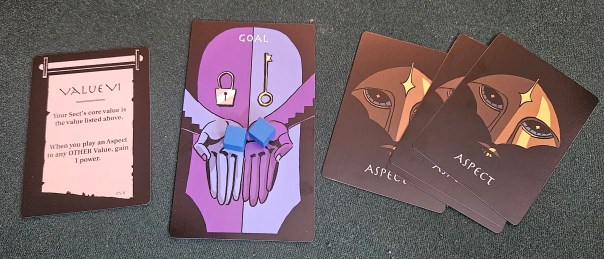 But we also each receive a hidden goal. Perhaps I’m Righteous, in which case I want to protect my core value at all costs. We will Recall the Old, forging a religion of calendars and feasts and constant observances. In game terms, this translates to me keeping as many aspect cards tucked under my core value as possible. But in that same session, you might be Steadfast. Even if it means abandoning your core value, you intend to achieve stability in our faith, ensuring that one half of the wheel is filled with as many aspects as possible.