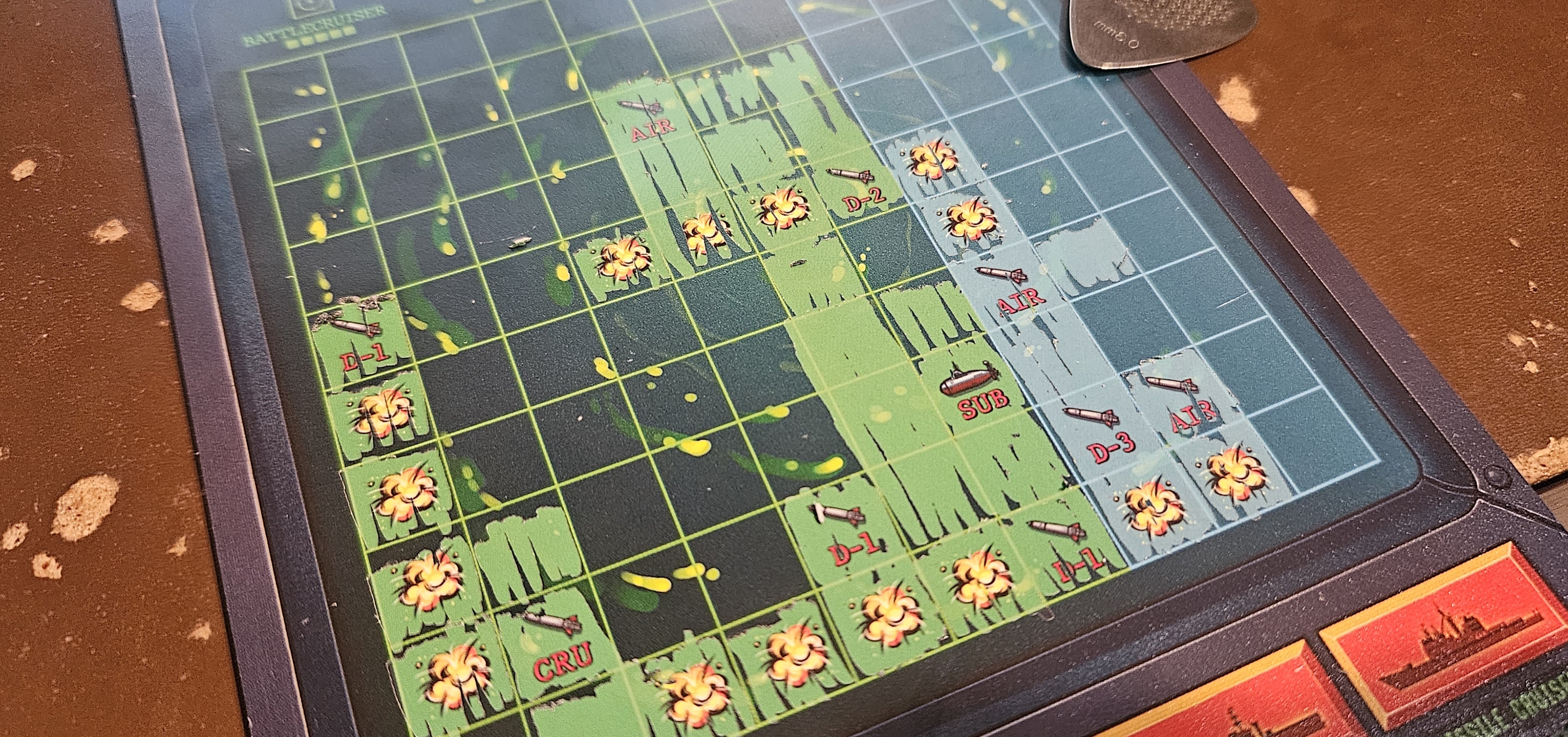 Your goal is to hit every segment of every enemy ship. There’s a rubric for these things: the enemy fleet contains one battlecruiser, which must be situated entirely in deep water, four shallow-water frigates, and a handful of cruisers and destroyers that might be scattered between the sheet’s halves. Missiles appear around these vessels’ edges, both hinting at their position and threatening to strike your fleet.