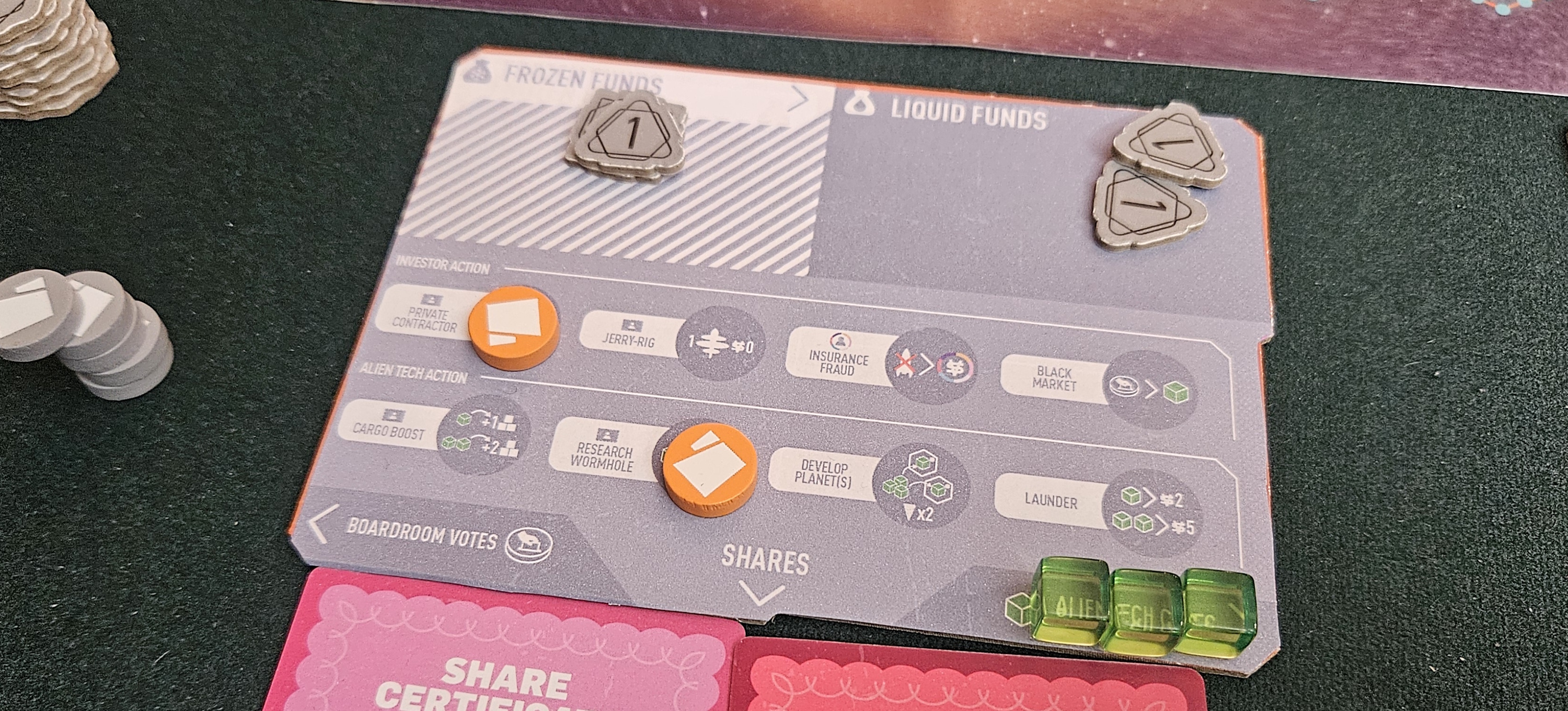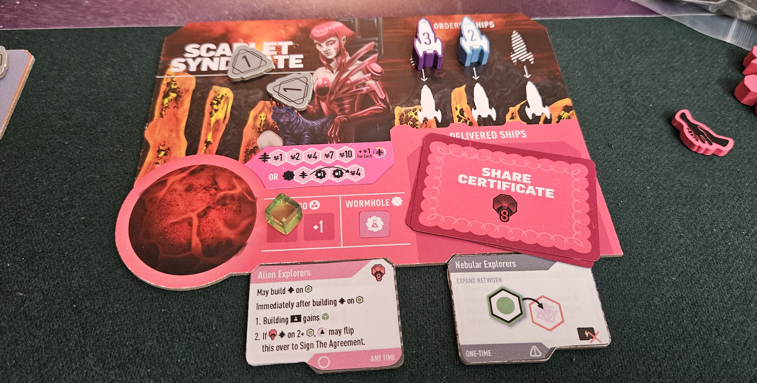 The tradeoff, naturally, is significant. When the game concludes, the final value of everybody’s shares is calculated for one big payout. These are highly lucrative, the sum of a company’s shipping and mining values combined. But if a company that signed The Agreement failed to best the alien race on the mining track, their shares are directly claimed by the aliens — and pay out for a single measly credit instead of their usual value.