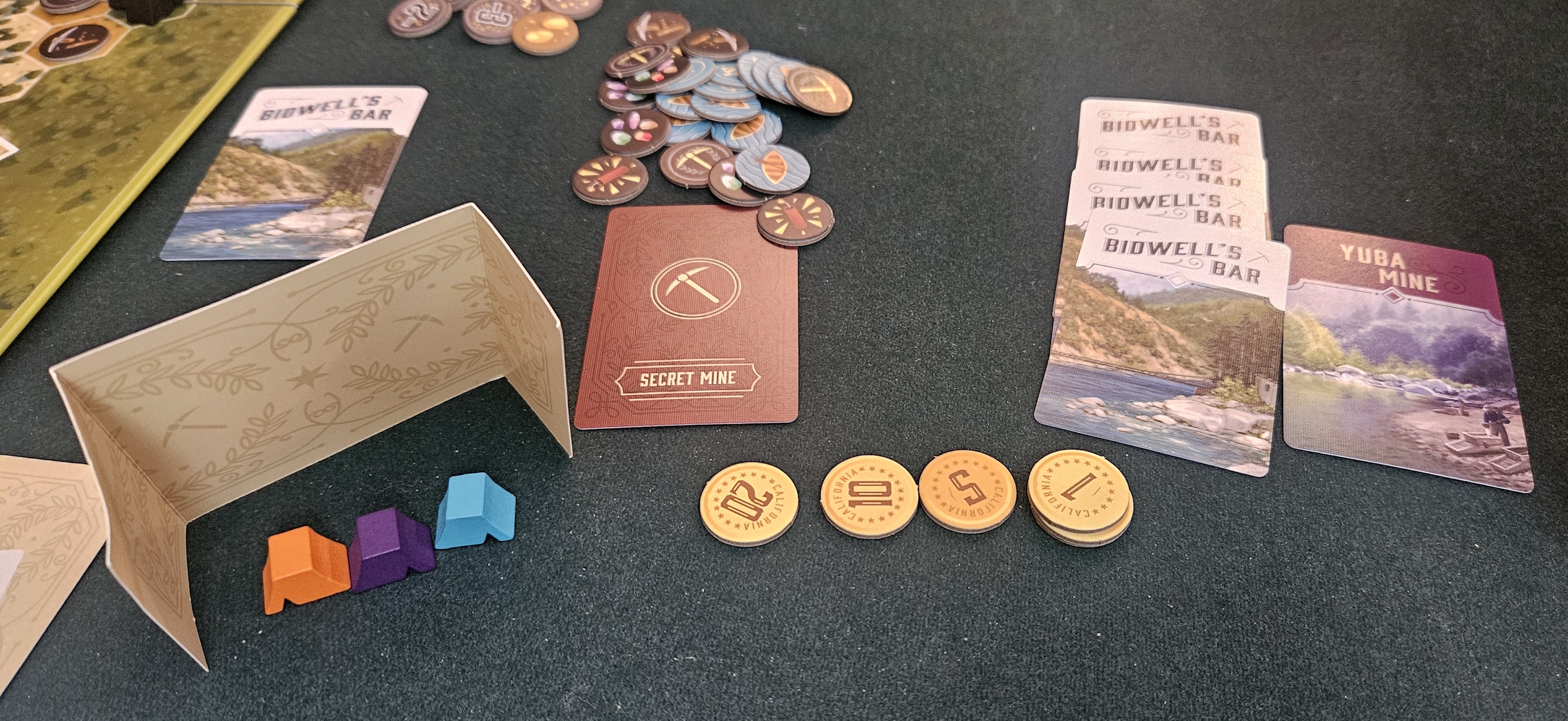 When Gold Country kicks off its private gold rush, there are four mines at opposite ends of the shared valley. Their value is five coins per share. Everyone at the table holds one share per mine, plus a secret share that won’t pay out until the end of the game, but which serves to ensure that no one mine gets abandoned entirely. At least not in the four-player game.