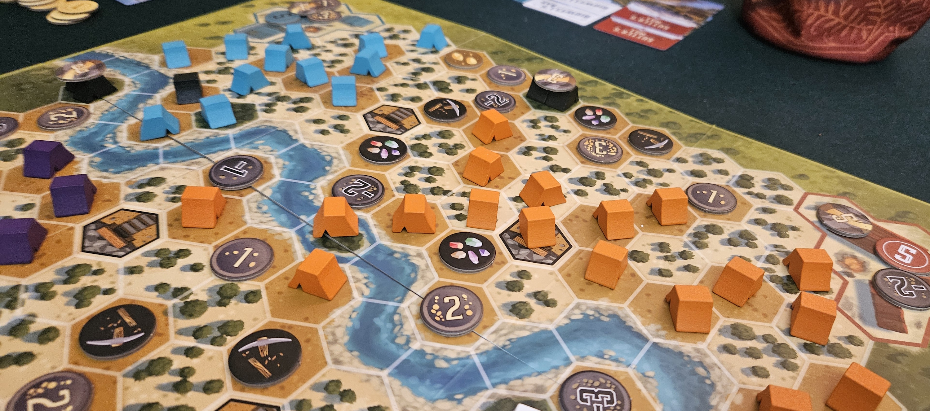 Most of my hangups have to do with the advanced side of the board. This one is bisected by a large river, although in practice this isn’t much of an impediment, since you can tunnel under it or ferry over it. Meanwhile, some of the new token types are more hassle than they’re worth. Gems award five dollars apiece when the game ends, giving players cause to hurry over to certain spots. Dynamite awards additional claims to whomever picks it up, threatening the rest of the table with much larger turns that don’t quite match the measured pace of the game.