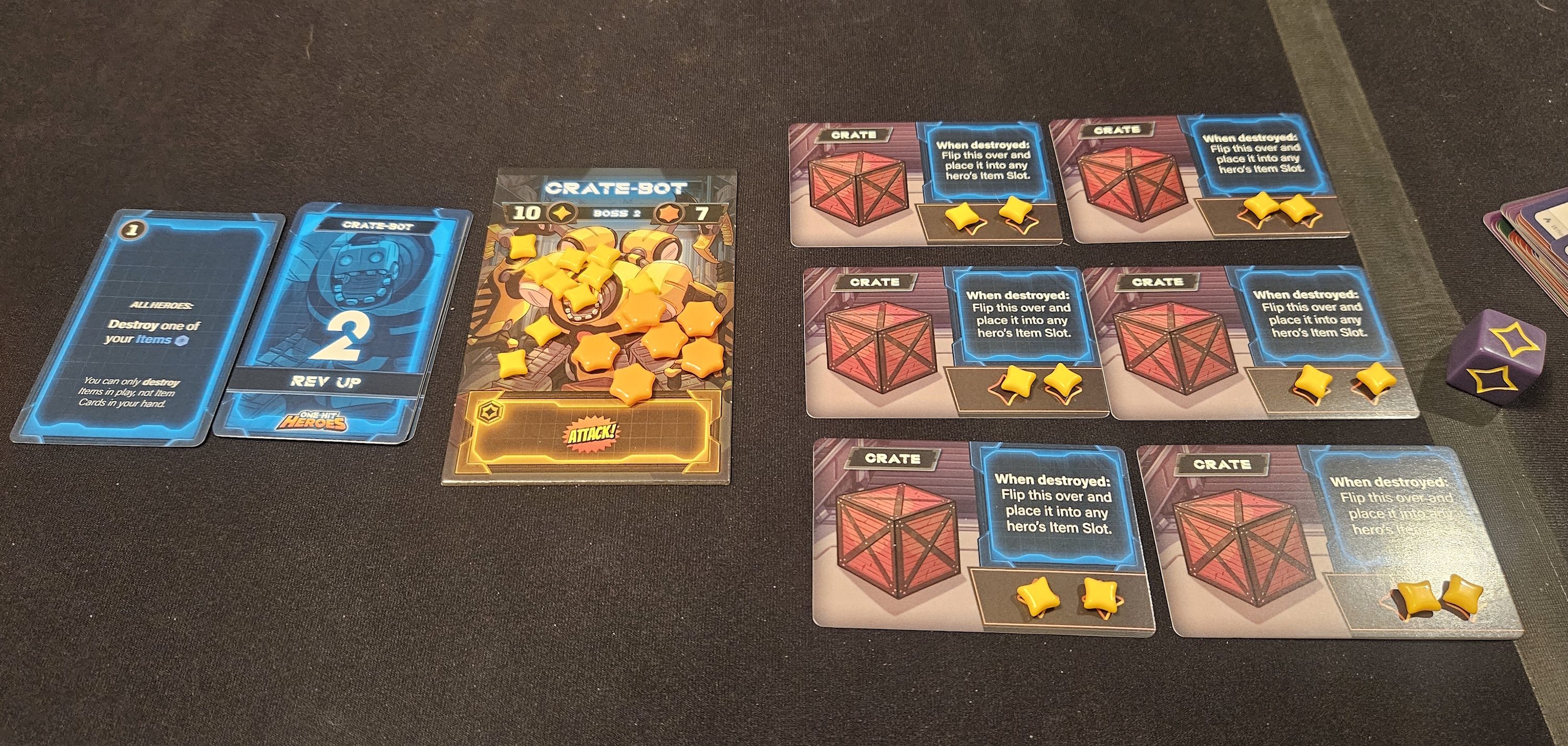 Everybody picks a hero. There are four in the box, each with their own set of cards. One-Hit Heroes is an economical little thing; rather than offering a slew of abilities, everything about the game’s four heroes comes back to their starting decks.