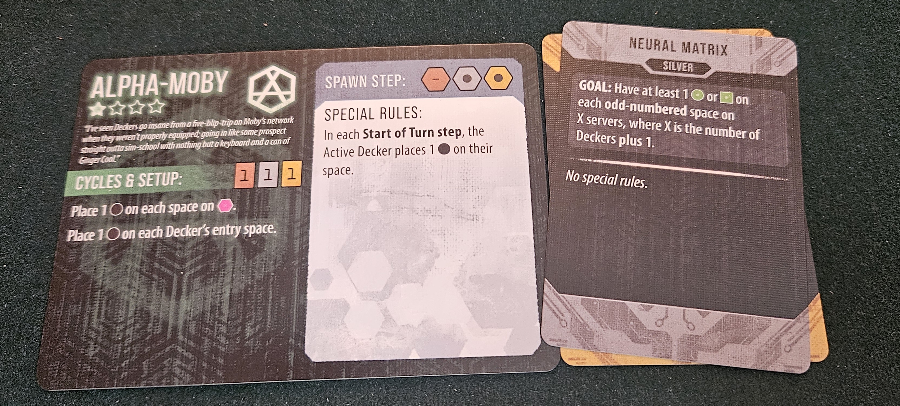 And then there’s the mission structure. Scenarios in Deckers aren’t scenarios so much as they are accumulations of objectives. First you pick which SMC you’ll be decking. (See? I told you there would be terminology.) Then you populate that SMC with objective cards. These range from the simple to the confounding. Sometimes they’re clear enough, like generating a network keycode by installing four different programs on your decker’s entry point. Other times, they tip over the edge into a nihilism of iconography. A couple plays ago, we flipped the final objective and discovered we were meant to create a “mirror map.” Every server on the table, all five of them, were to have an identical configuration of programs, both friendly and rival, with at least one program of the four primary types. Such a goal might be easy or might be hard, depending on how well the mission had been going up to that point and whether the current SMC would add and/or shift lots of nasty counterintrusion programs, but it will never seem like anything other than the sort of busywork a teacher hands out to their fifth-grade students when there’s only forty-five minutes left in the day and she’s come down with another migraine, dammit.