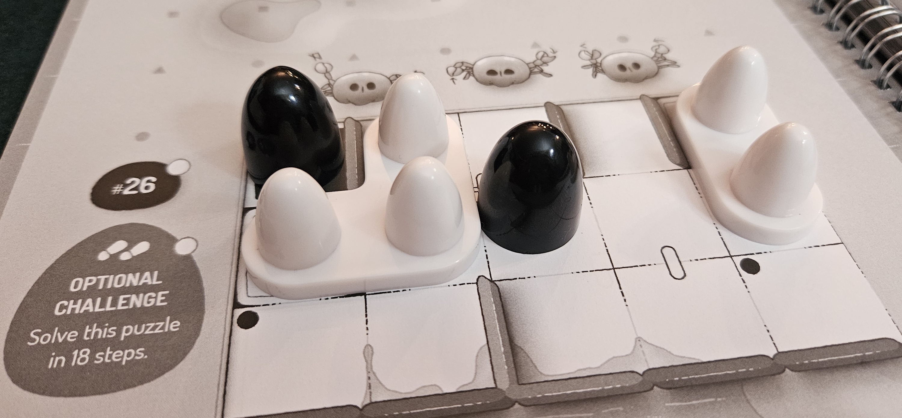 Then holes for trapping herds, turning them into static pegs that can be hopped over but not shifted free. Then variable setups, multi-page puzzles that see you shepherding in pieces from variable angles, pages that contort as they shift across the spiral binding, hidden objects, [redacted]. The dance chart grows more complicated, less the steps to a waltz and more the cow-hide puzzle of a ballet.