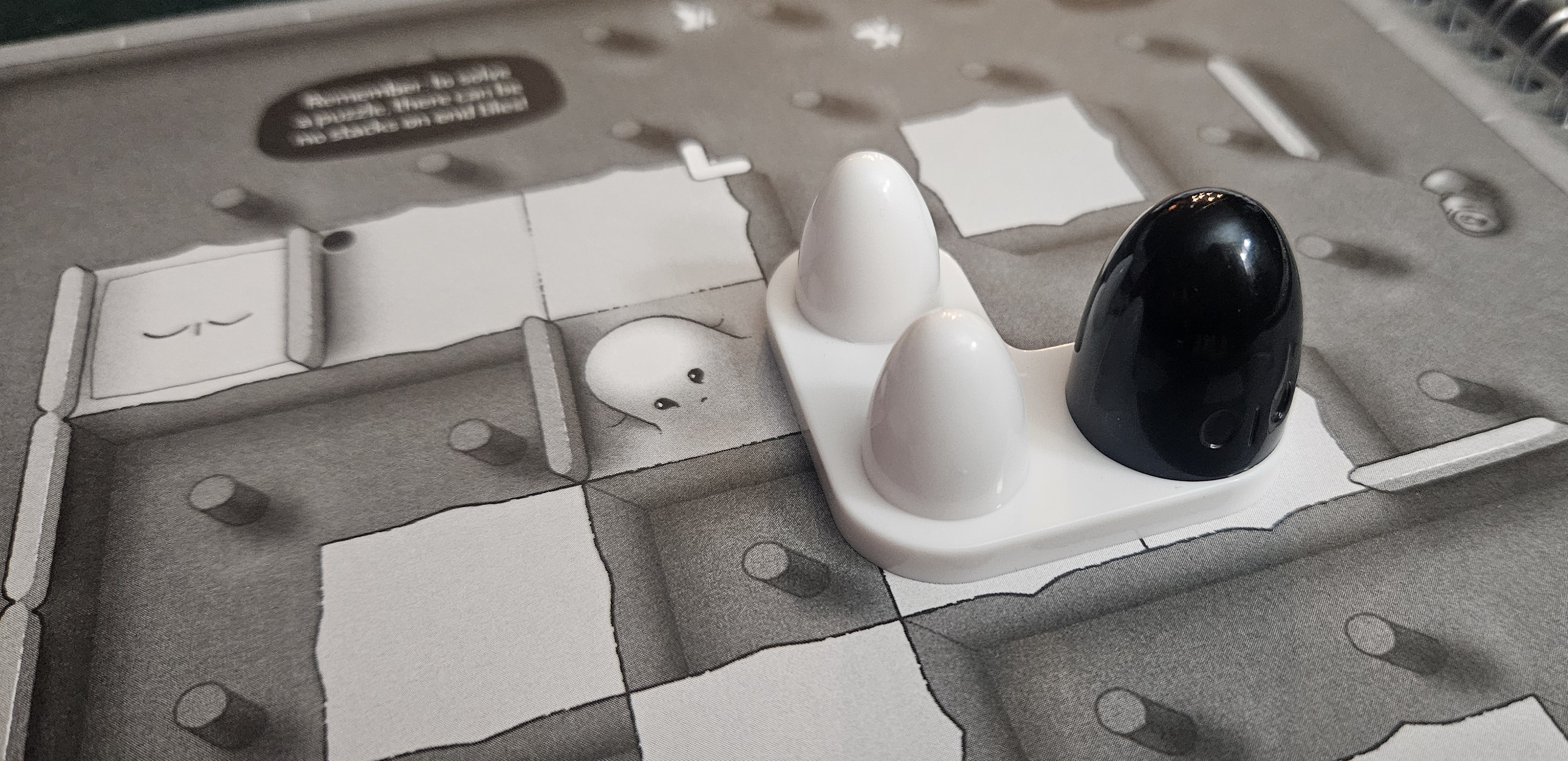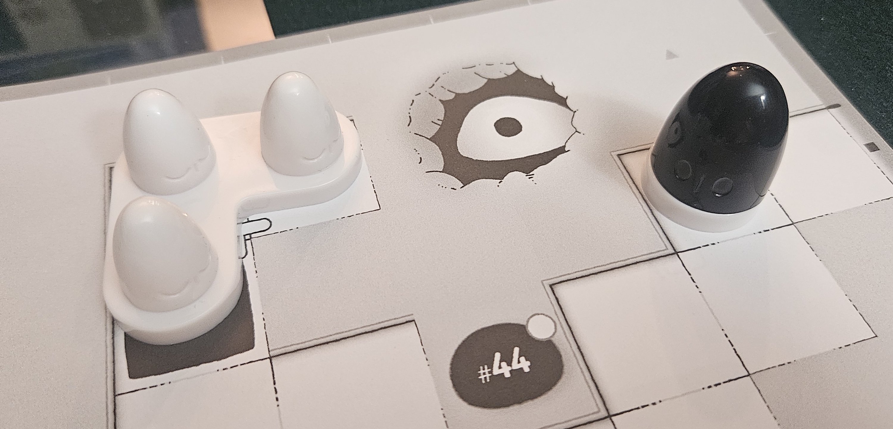 To some degree, this marks Herd as Gracar’s most conventional offering yet, although that’s like calling a coronal loop dimmer than the sun that birthed it. Even as someone who’s grown weary of sokobans, the formula here is distinct enough that I couldn’t help but leave the game set up on my game table for nearly two months, beckoning for me to tackle just one or two pages at a time. There its wide-eyed shepherds and sleepy herds called to my twelve-year-old; she learned it with me, then designed her own puzzle sliding game based on its moveset and stacking. The whole way, I was always eager to see the next ace up Gracar’s sleeve, never bored with the previous trick. That’s the game’s secret weapon. Its pacing is immaculate. As soon as one concept becomes second nature, it’s onto the next thing, and then the next, the previous lessons unfolding into the texture of each page.