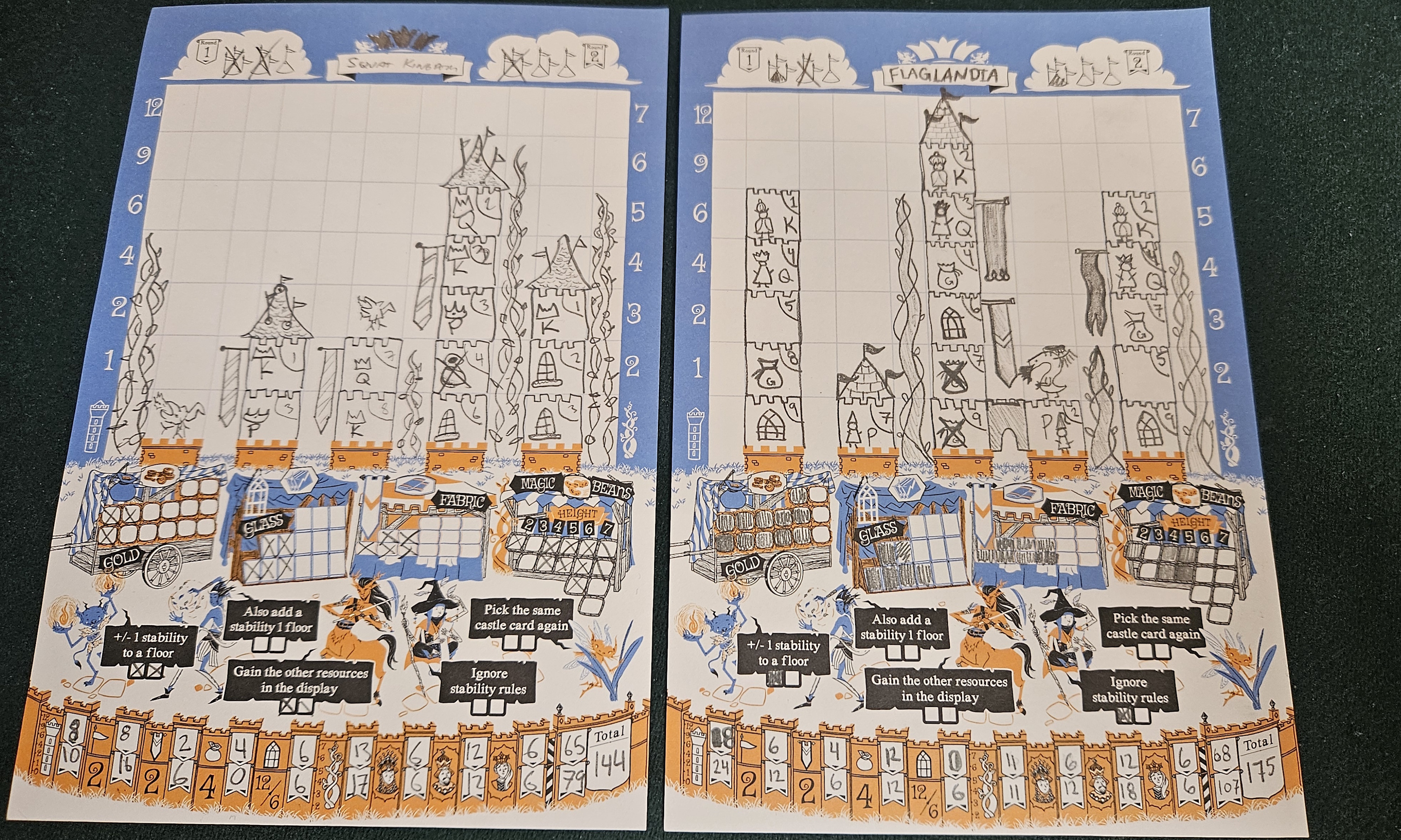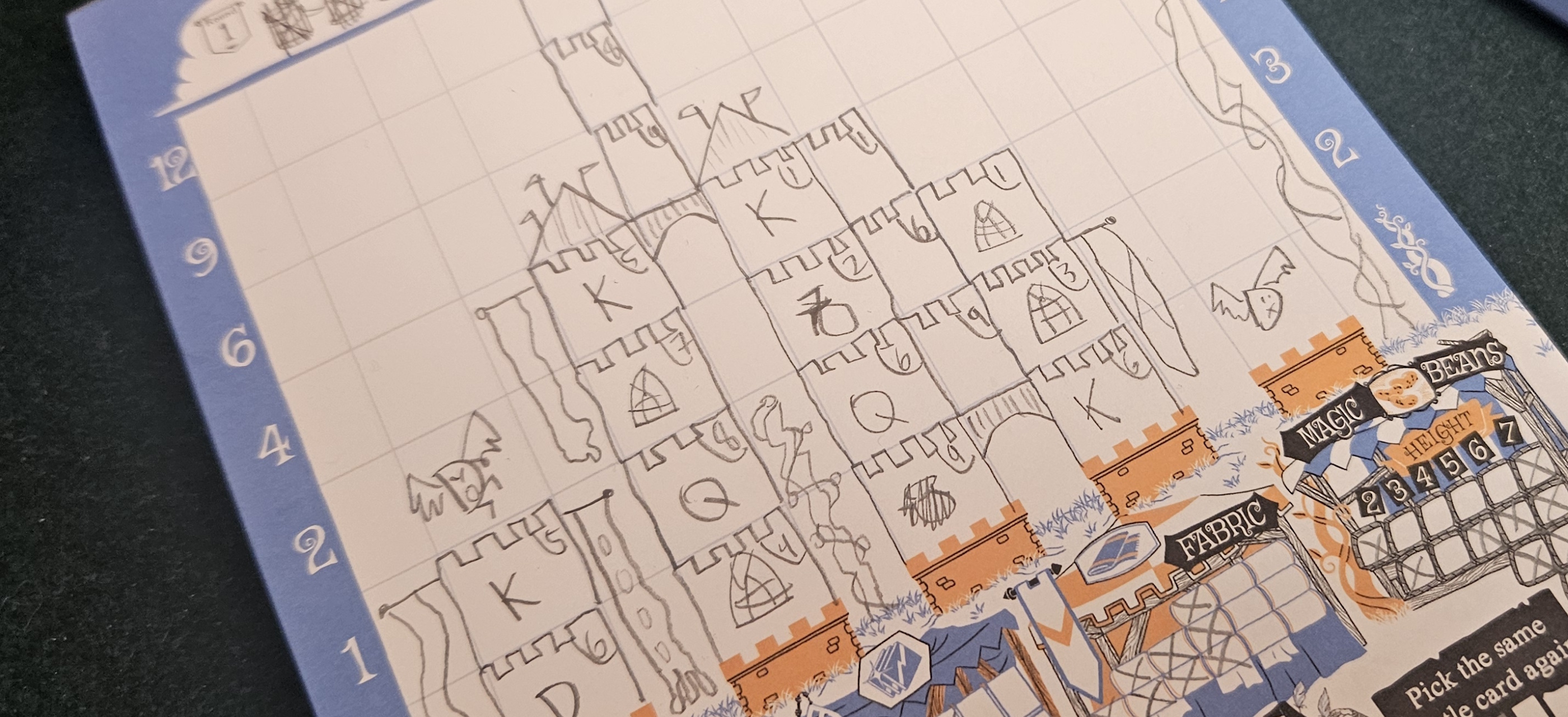Finally, every card also provides a material of one kind or another. The format for these is simple enough, adding new features to your castle whenever you complete a material’s column. Hence glass introduces windows to your castle, bags of gold eventually fill entire floors, and banners hang from on high while magic beanstalks creep up from below. In fine flip-and-write fashion, these soon jostle for space. There’s room for planning, but remaining inflexible is a surefire way to get nothing done at all.