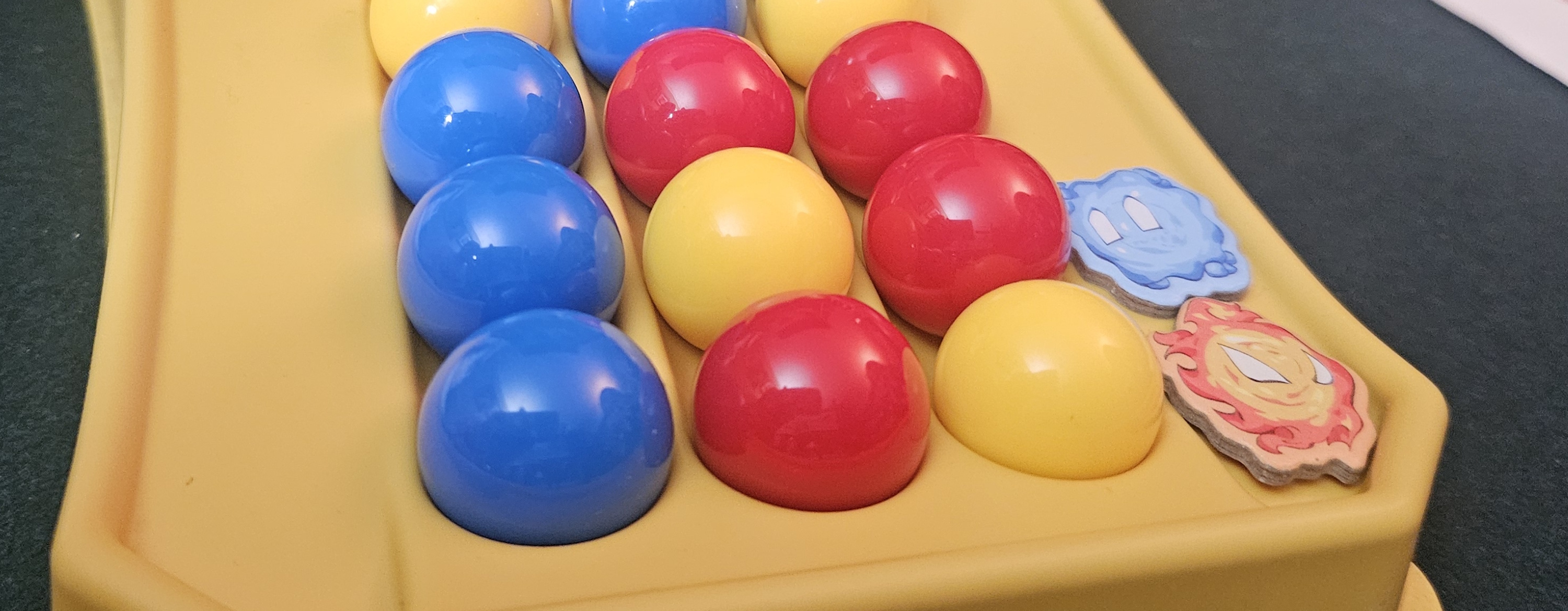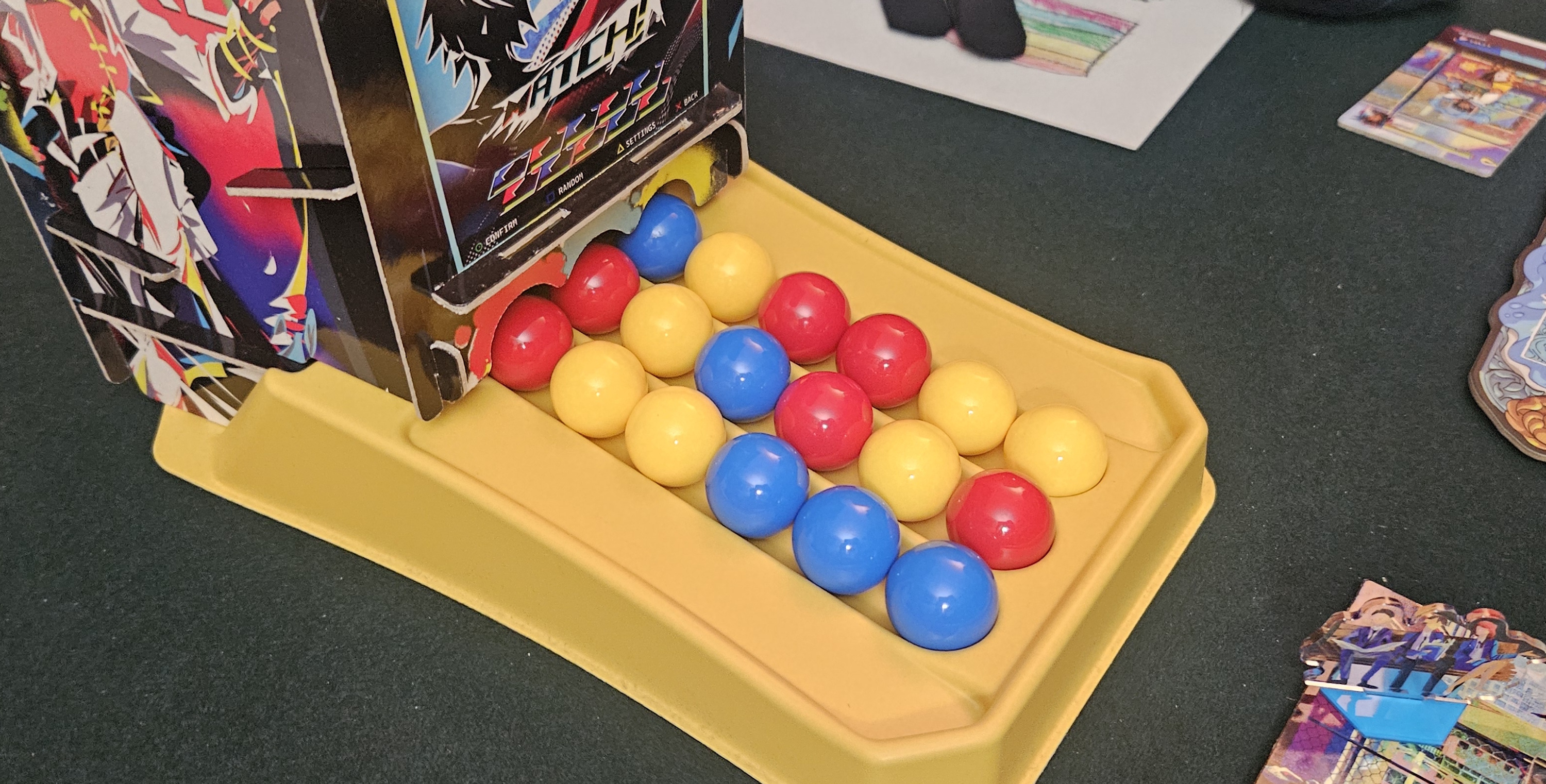 The big visual draw is the marble tower. The closest touchstone is the box from Potion Explosion, which, if you’re in the mood to suddenly feel old, came out a lengthy eleven years ago. The marble tower in Re;MATCH is even simpler than that game’s, producing three lanes of balls in three colors. It’s marble-matching so simple a baby could do it, right before trying to eat the marbles.