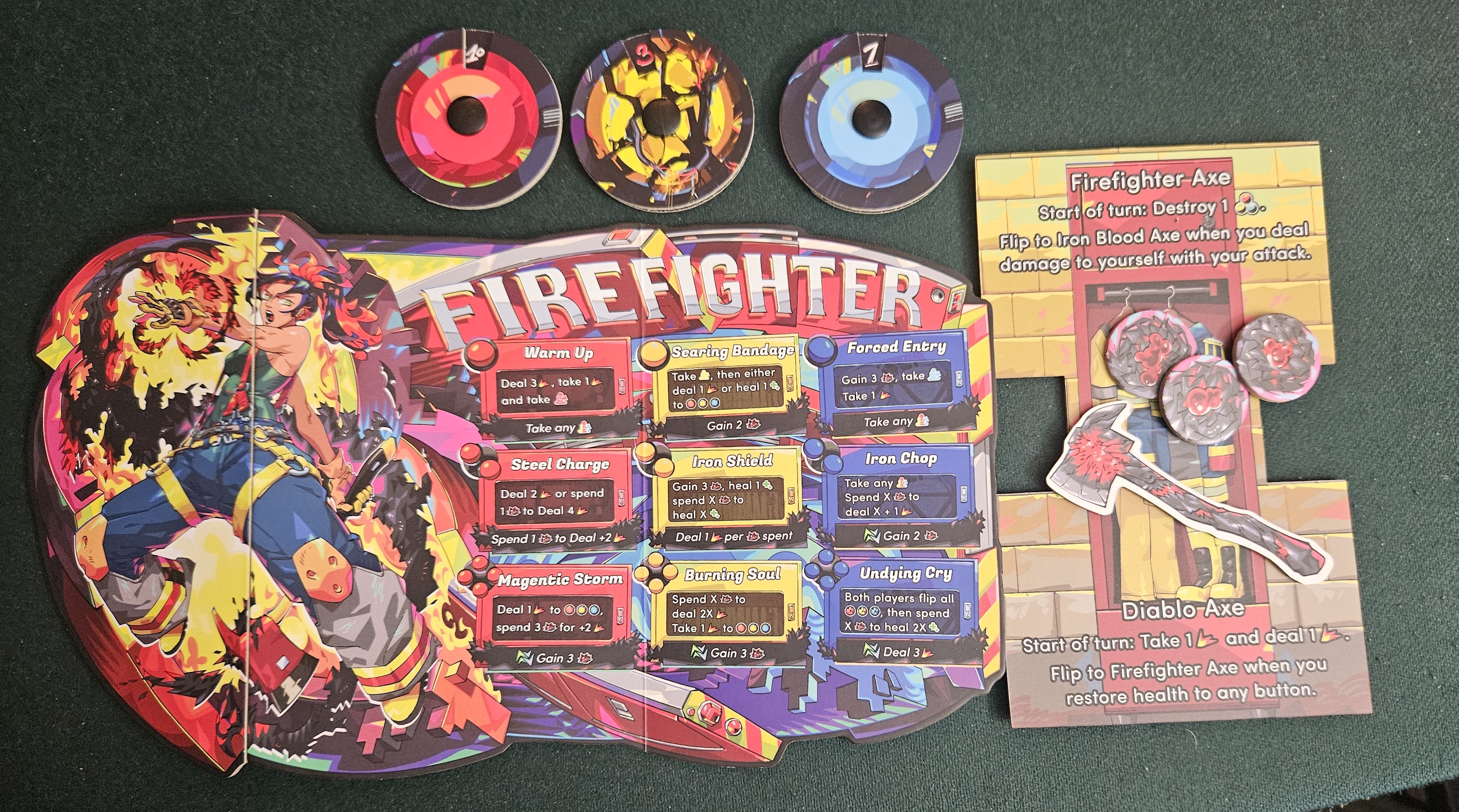 Naturally, the D.J.’s moveset includes normal stuff. She wins over fans. She deals damage. The usual. But her real abilities revolve around dropping, advancing, and killing beats. Her entire setup is one cacophonous wall of sound. Like the firefighter, she’s all about tempo. But the way those tempos function couldn’t be more different. The firefighter is all about managing two very different modes. The D.J. is the board game equivalent of a Shepard Tone, always ascending, always building momentum.