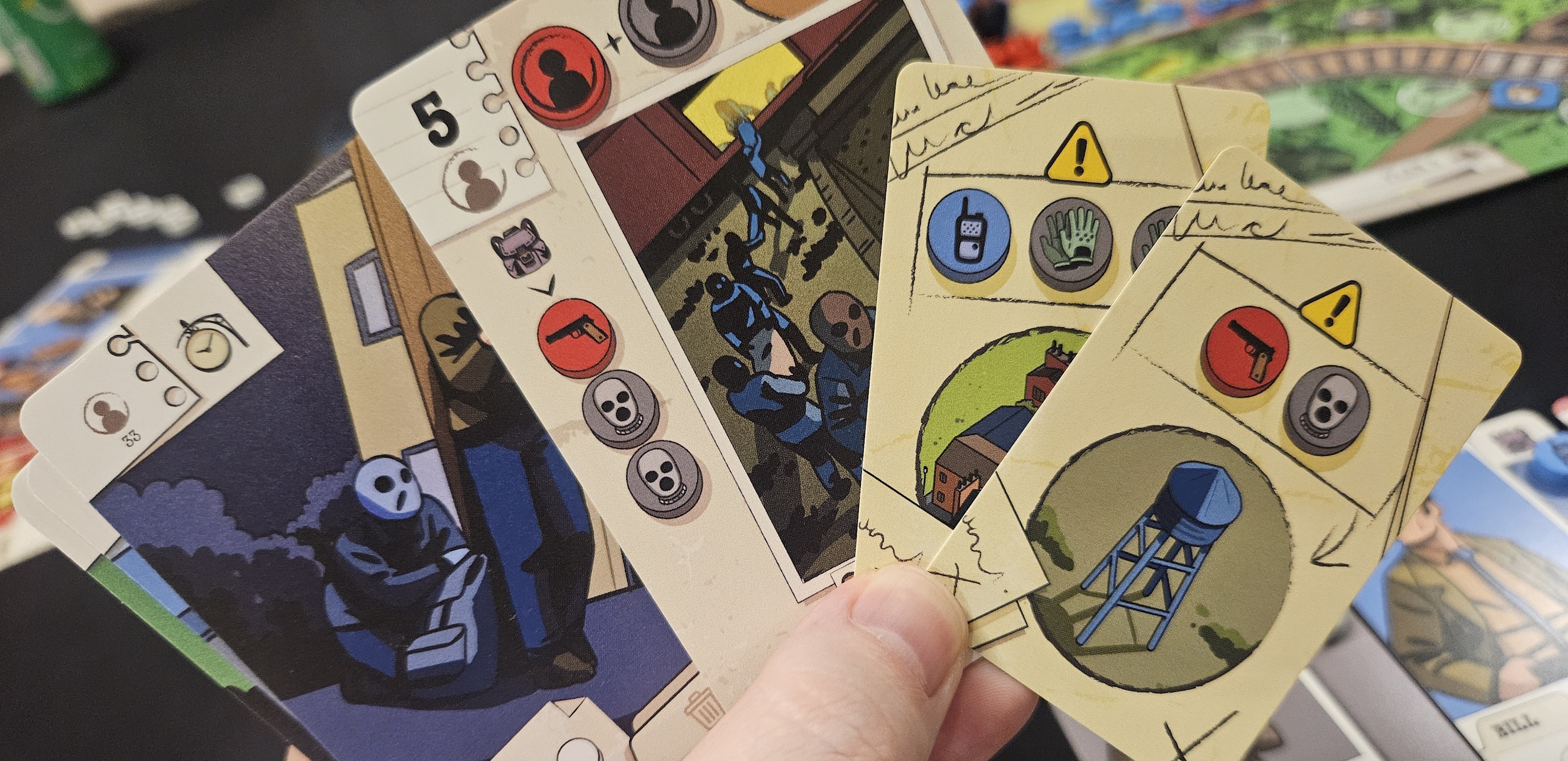 But as the Coordinator, how do you tell your partner what you need? As the Operative, how do you hint that you need an extra gun and some gloves to solve the problem over at the water tower? The easiest option is to call them up on the radio, but these opportunities are few and far between. Limited, too, with players only capable of speaking two or three words per card. So other possibilities appear. Maybe you can divide the tools in such a way that your partner realizes you need extra rope. Maybe you boot another smooth-talker out of the safe house for them to walk down to the tracks. Maybe, eventually, you thump the table or something. That’s probably cheating. But you know what they say. Ninety percent of all communication is cheating.