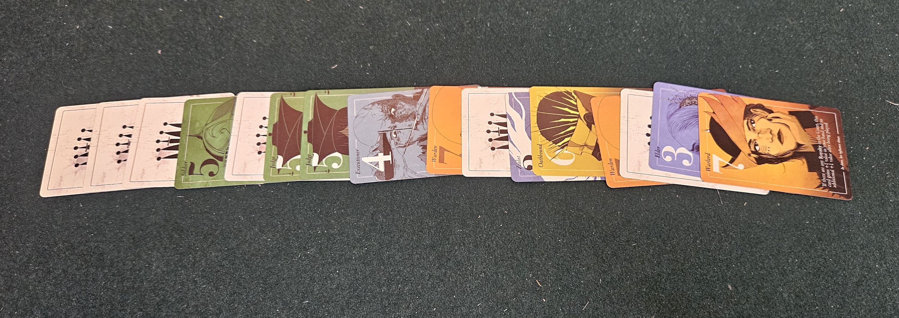 But like six-year-old Dan deciding that ones can beat tens, these gestures still sometimes come across as patches. Even at the best of times, The Imposer Kings asks a lot of one’s short-term memory. What you’re holding, what you’ve seen played to the court and then disgraced, which cards you threw away when the round began. The player aids are helpful, listing every possible card at the table, but they stumble by not revealing which cards have a duplicate in the deck. Not that it takes a long time to recognize which singles are actually doubles. One benefit of only using eighteen to twenty-something cards is that there isn’t that much to hold in your head.