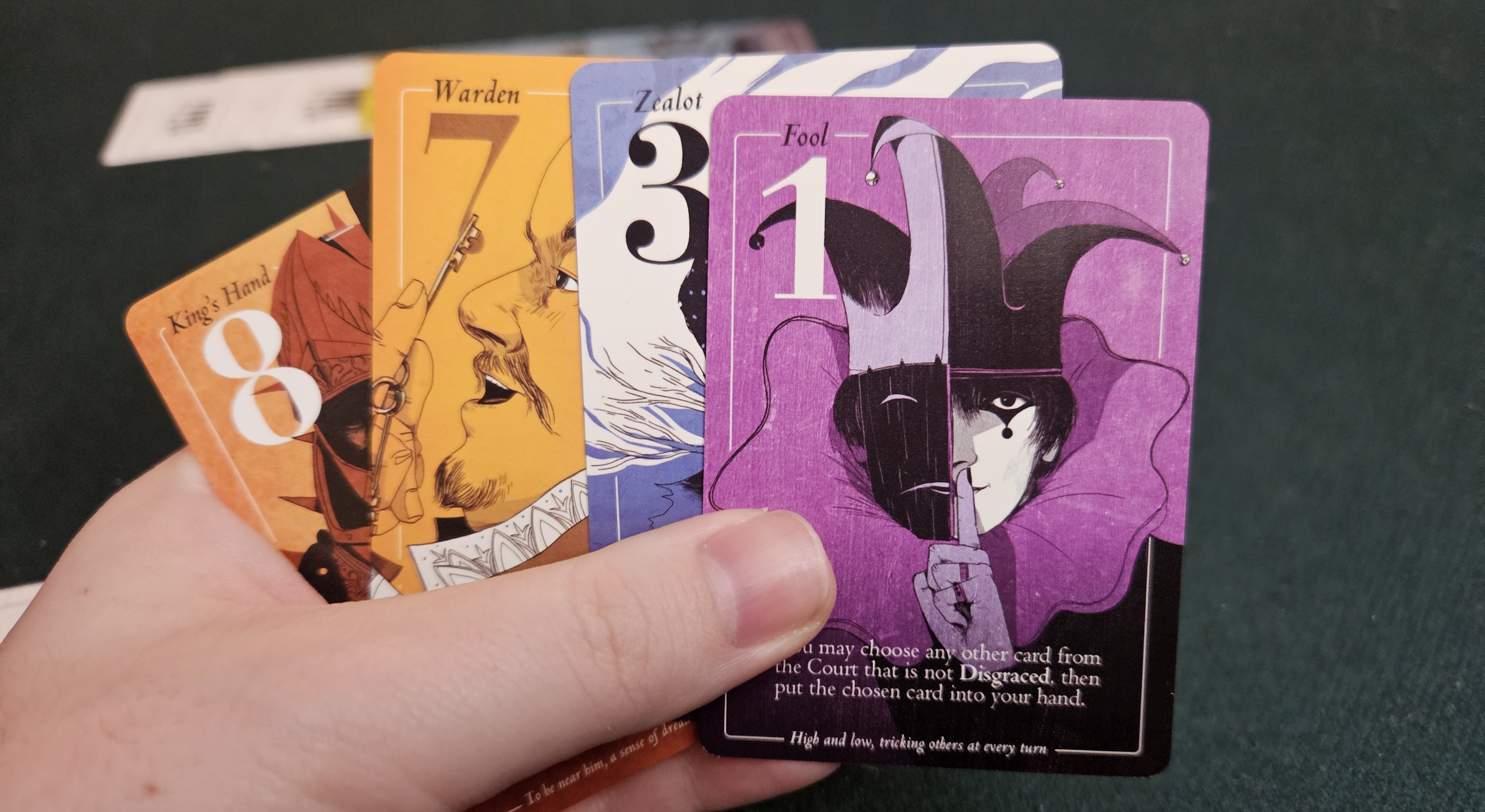 But there’s the question of everybody’s King. When the game begins, everyone is dealt a King. They then choose a card from their hand to place face-down next to the big guy. This is their successor. Once per game, you can flip your King and take your successor into your hand. Oh, and the card currently on the throne? Disgraced. Face-down. Value one. Boop de boop.