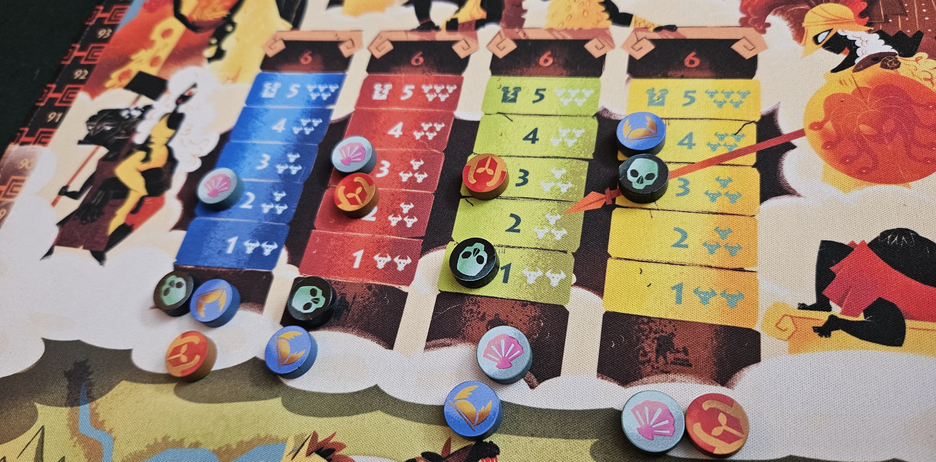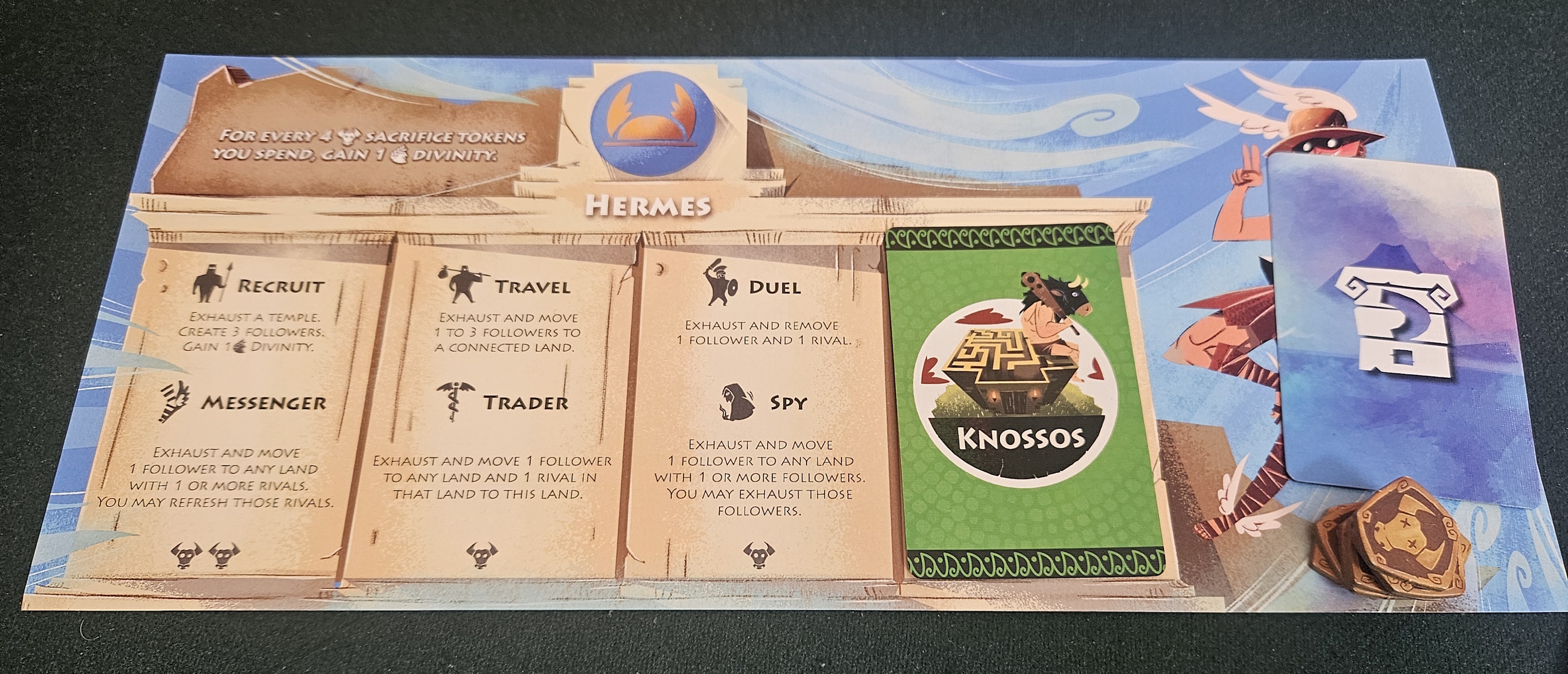 This phase occupies the bulk of a round. Going around the table four times, each god takes turns manipulating the mortal wars, expansions, and offerings of the Aegean. As with the previous wagers, there are stark limitations. The short version is that you can manipulate mortal events quite broadly, but only provided you’re holding the right cards, the desired action is still available, and, if you’re going for one of the more powerful options, have enough sacrifices on-hand.