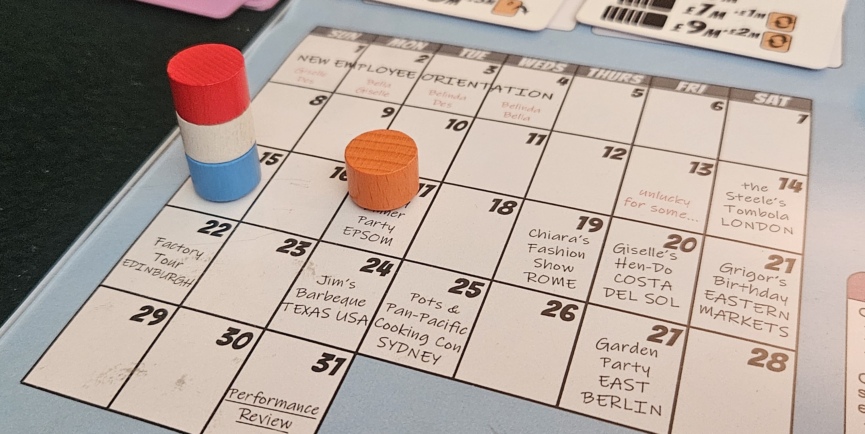 Look, this is the first problem with Belinda’s Big Bonus, and it’s a doozy. As any gaming evangelical knows, it’s hard enough describing a board game to newcomers, and Belinda’s Big Bonus is no board game for newcomers. There are mechanisms aplenty in this trunk, packed together like someone mixed the first-aid kit with the snack bag. There’s a calendar timekeeping system, the kind popularized by Martin Wallace titles, and cards that may exist either in a market, your hand, or a tableau, with interactions dependent on their current source — except sometimes they can be spent from two of those places, and the rulebook is conversational and, although it’s amusing, this doesn’t lend itself to learning the damn thing.