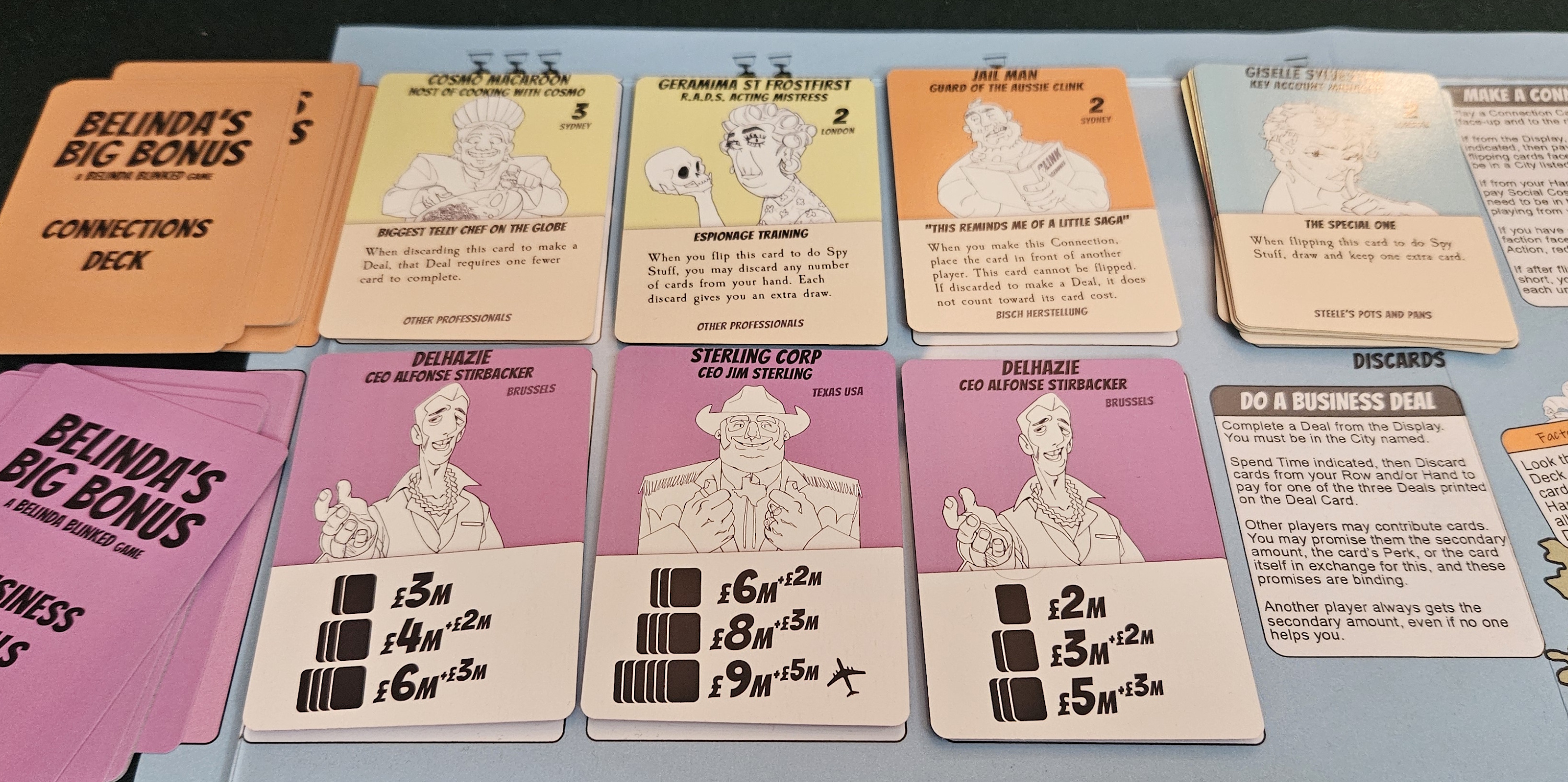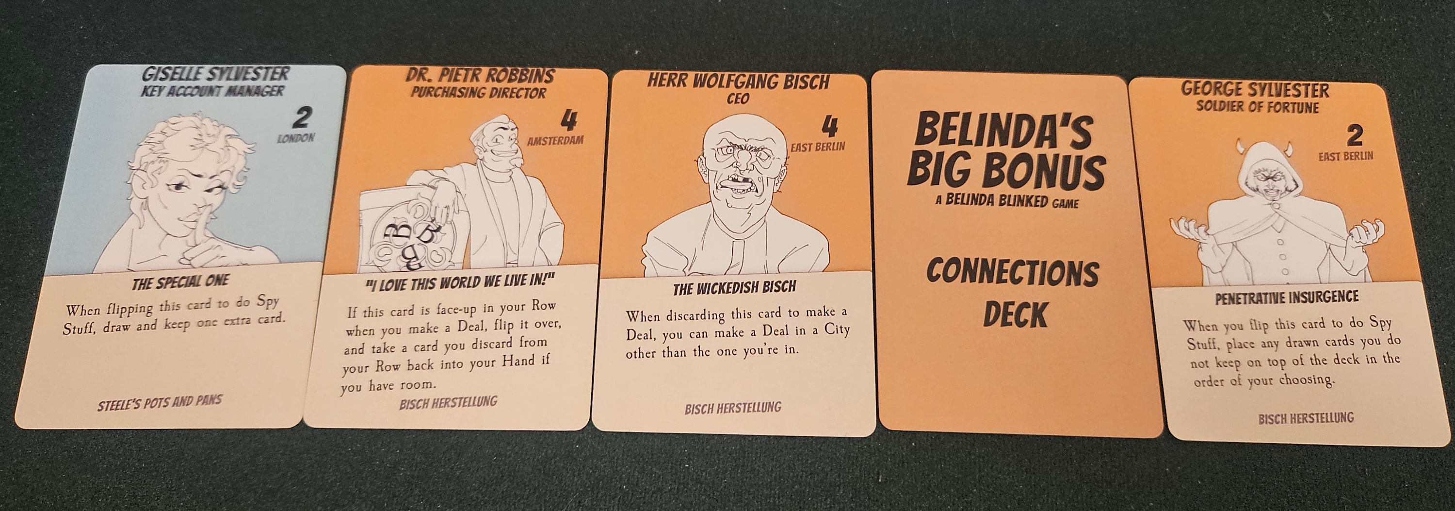 Here’s another example. Belinda’s Big Bonus includes the possibility of a traitor moment. When the game concludes, the player in last place might reveal that they now hold the majority of connections to Steele’s rival firm, Bisch Herstellung. This turns them into “the special one” and wins the game in a sudden coup. Cool!