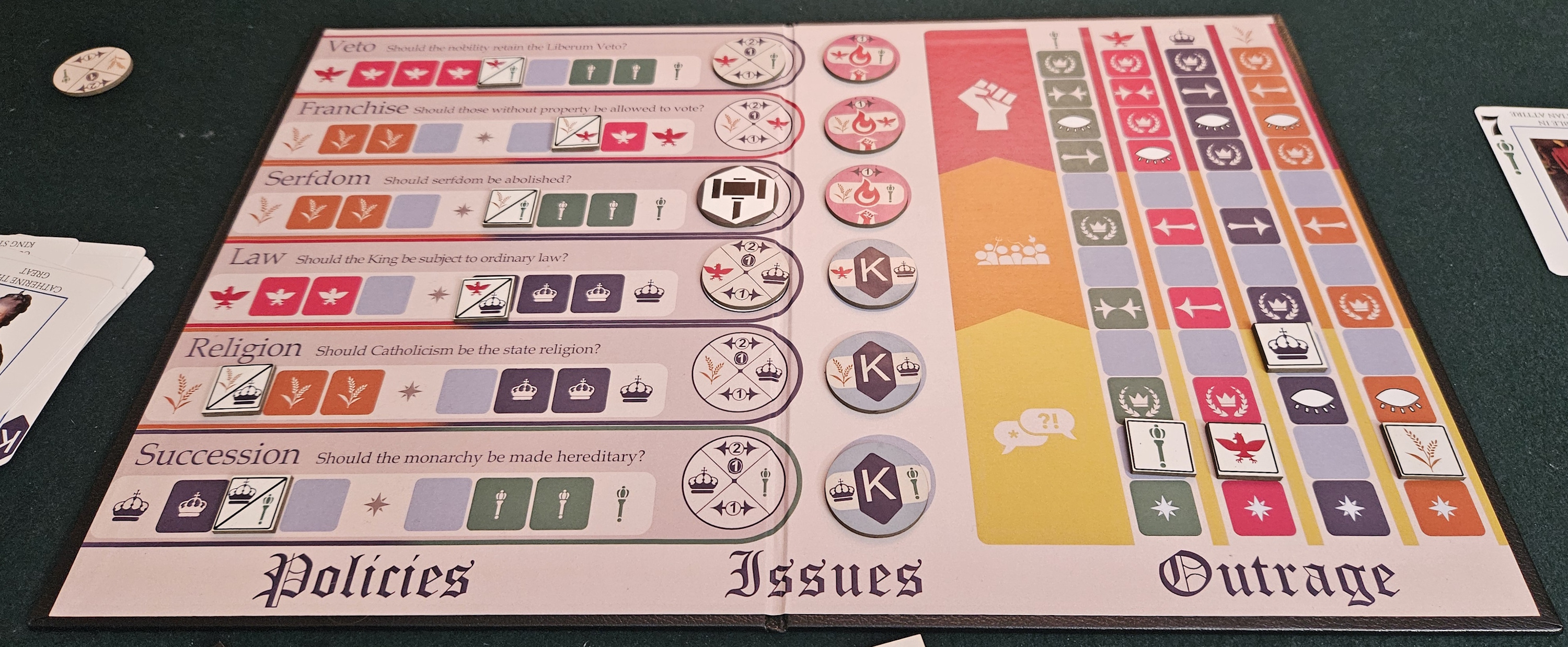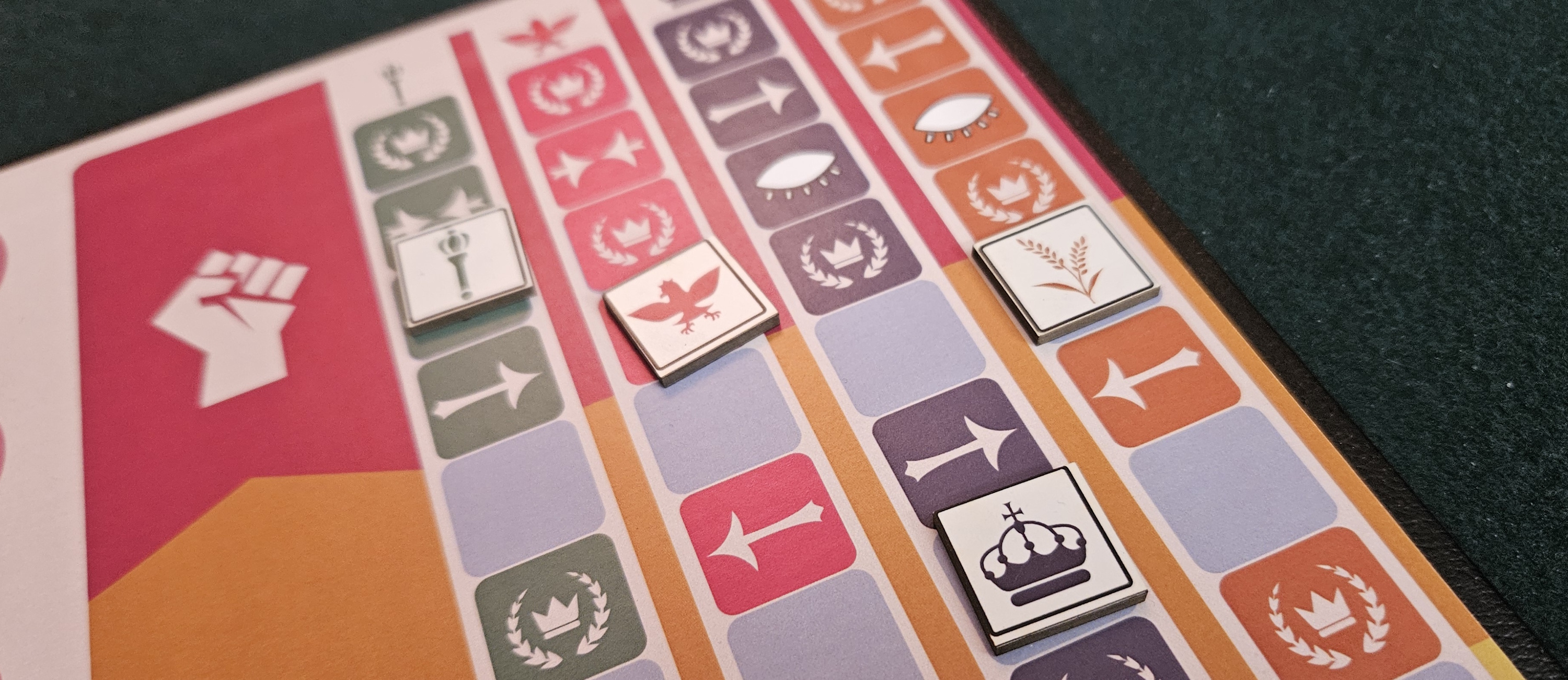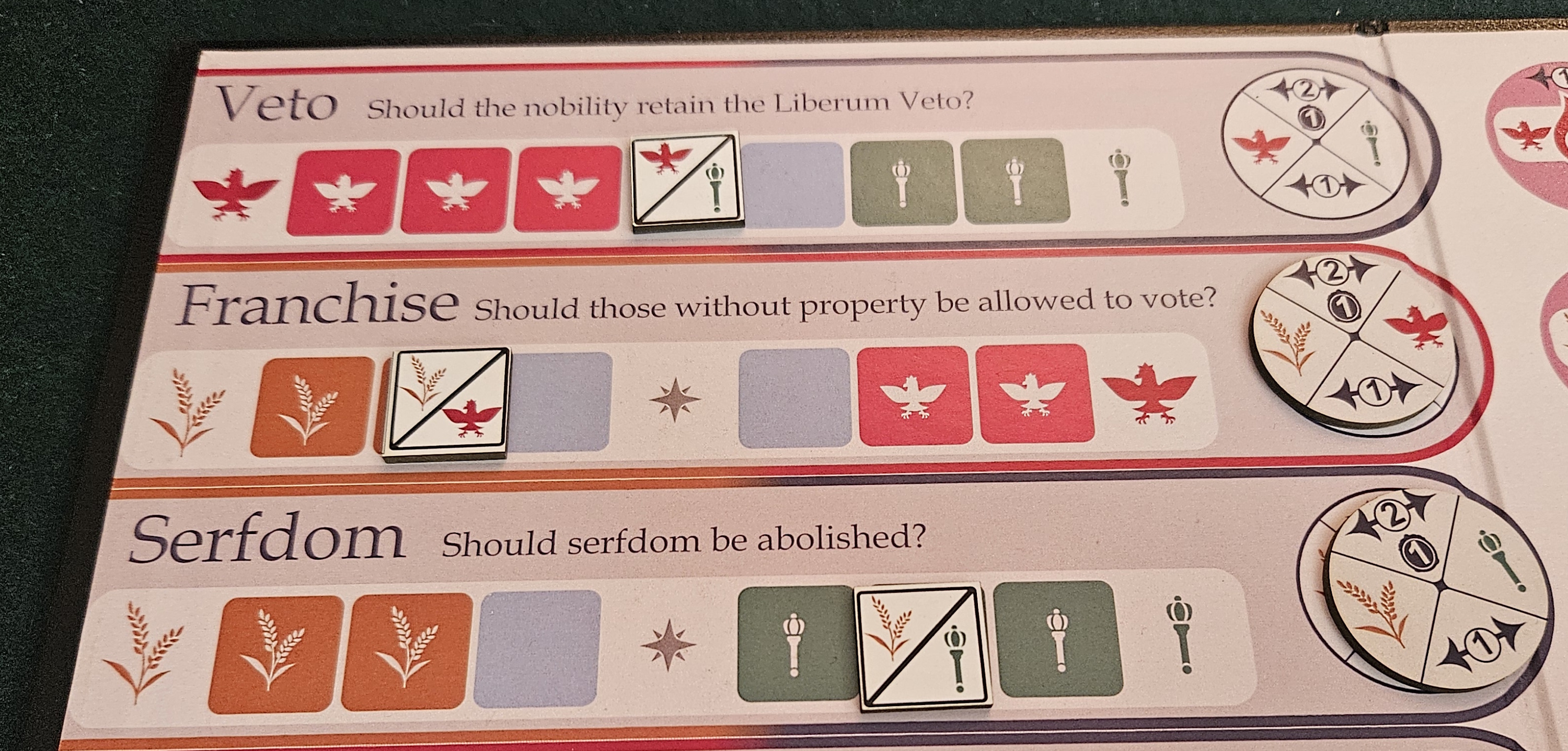 Which is why the tracks are important, but not all-important. Each faction has other aims to consider. The Regime derives most of their points from the tracks, which makes sense, given how badly they want things to remain the same. But they also care about tamping down societal agitation and keeping control of the gavel, the marker that dictates who picks the issue up for debate. Reform, meanwhile, is happy to be included at all, so any issue they win becomes political currency, even those that have nothing to do with them.