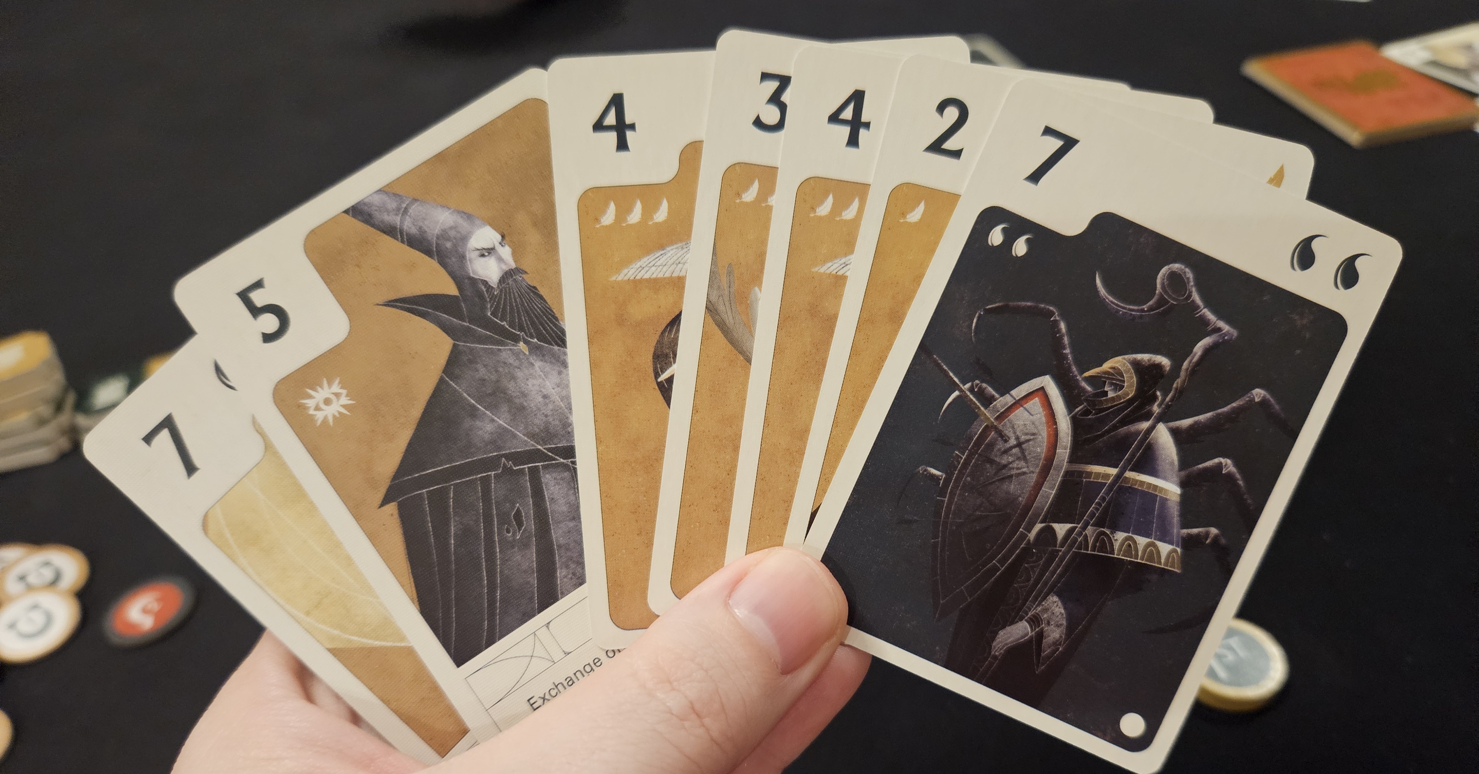 Again, it initially feels genius. There’s room for subtlety. Each lane can accommodate a face-down card per player, allowing both sides to conceal their motives. Is your opponent trying to win that lane with their best cards, or nudging it toward a negative scoring value in the hopes that you’ll invest all your strength there instead? Most cards are straightforward strength values and feather/scorpion icons, but their possible range — as low as one strength, as high as nine — is enough to ensure some major swings.