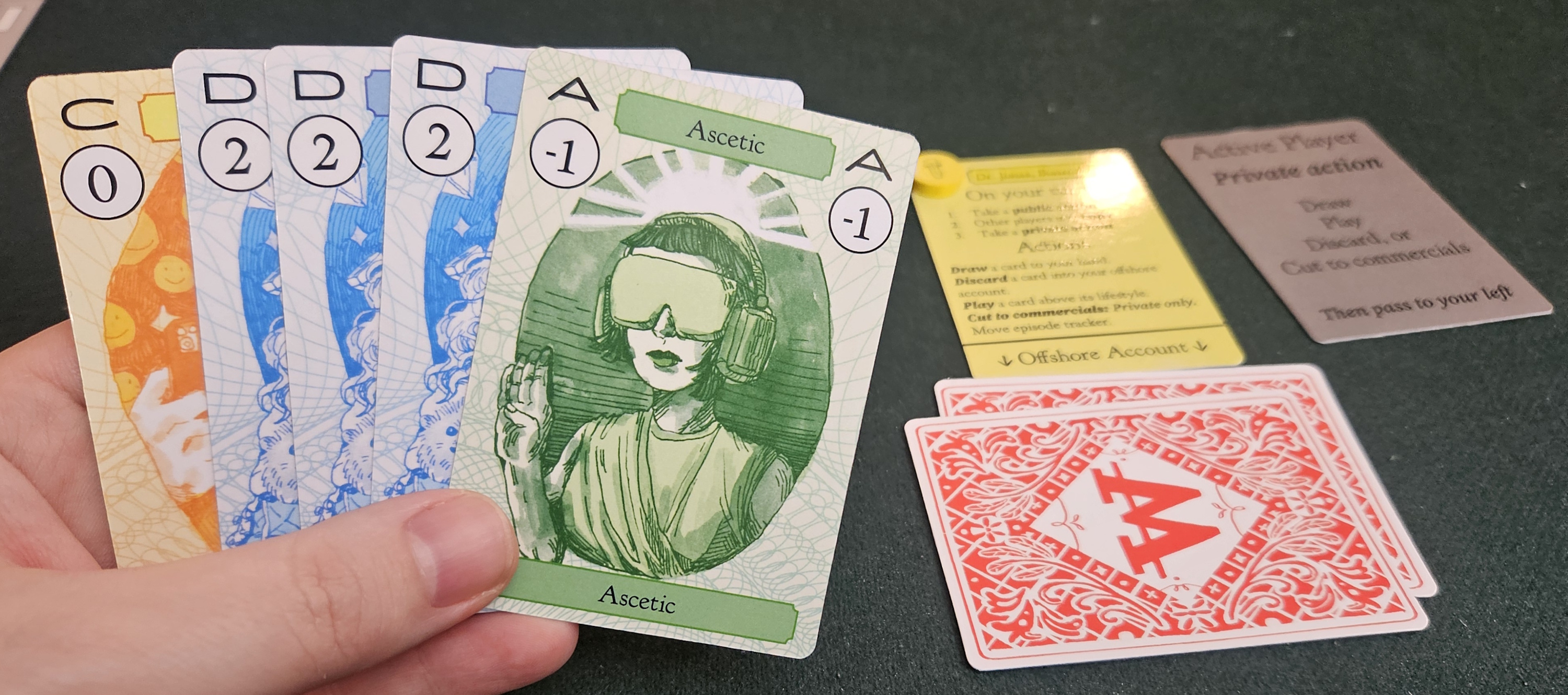Turns are simple, but the life cycle of content is anything but. Turns consist of two actions, one public, which other players are then given the chance to replicate, and the other private, for your lonesome alone. There are only three actions to speak of: one for drawing new content into your hand, another for developing positive content for the numb masses, and a third for concealing negative content in your offshore account.
