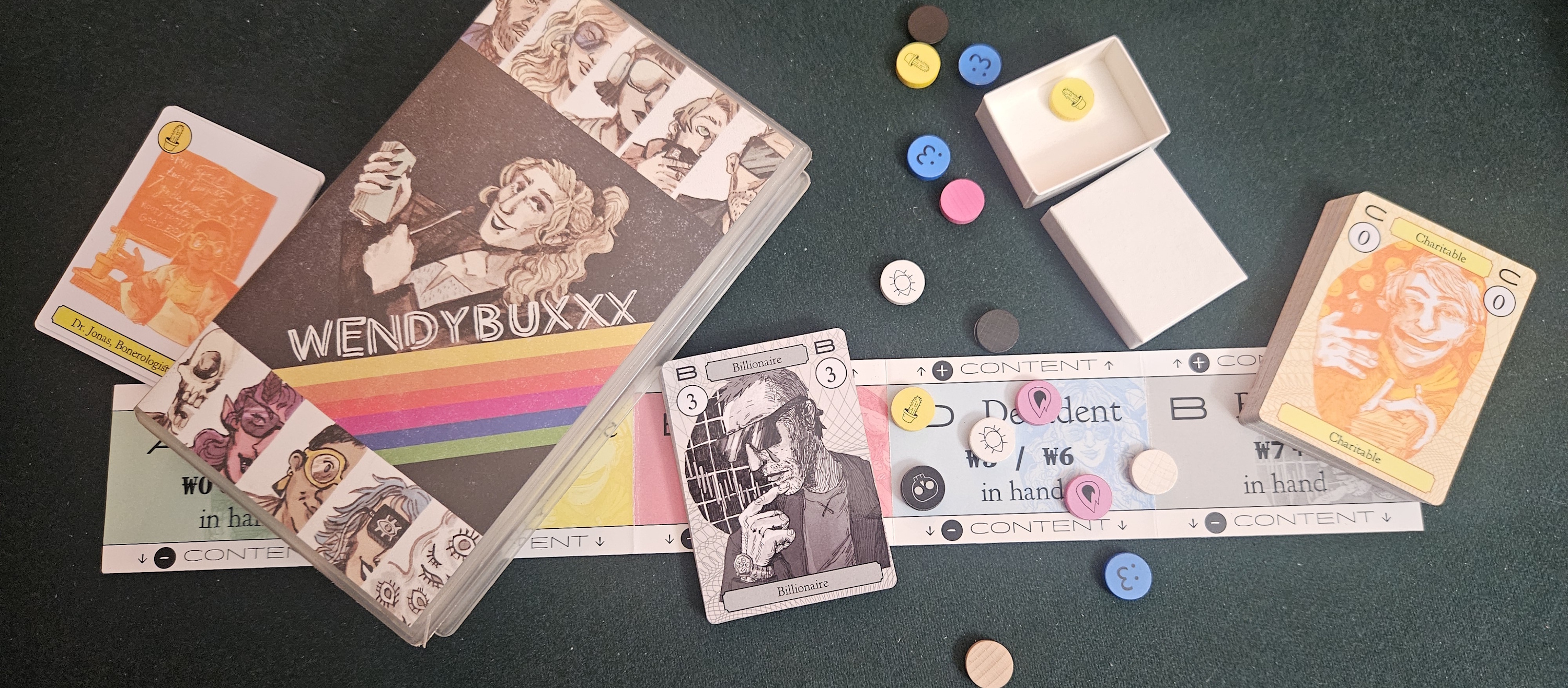 Maybe it begins with outward appearances. Wendybuxxx arrives in an old VHS rental case from peak-epoch Blockbuster, all milky plastic and dulled edges. There are two boards, one folded in half and the other segmented like an accordion, and cards in five colors with the contrast pumped up until they clash like jagged teeth. The characters are embodiments of dislocation. There’s Holly, the Cyber Witch, winking behind cyberpunk-esque shades, and Dr. Jonas, Bonerologist, eagerly describing the wonderful world of boners. The Eyes have seen too much, the Queen of Hell has shaped gender into a razor-edged weapon, and the Skeleton Salesperson reminds me of the old friend from elementary school who asked if he and his wife could have an important conversation with me, then began his sales pitch with a fumbling, “So, you might have noticed that we wear nice clothes and take care to present ourselves in a certain way…” After fifteen minutes of preamble, his embarrassment caught up to him and he refused to tell me what he was selling. I wish I was making this up.