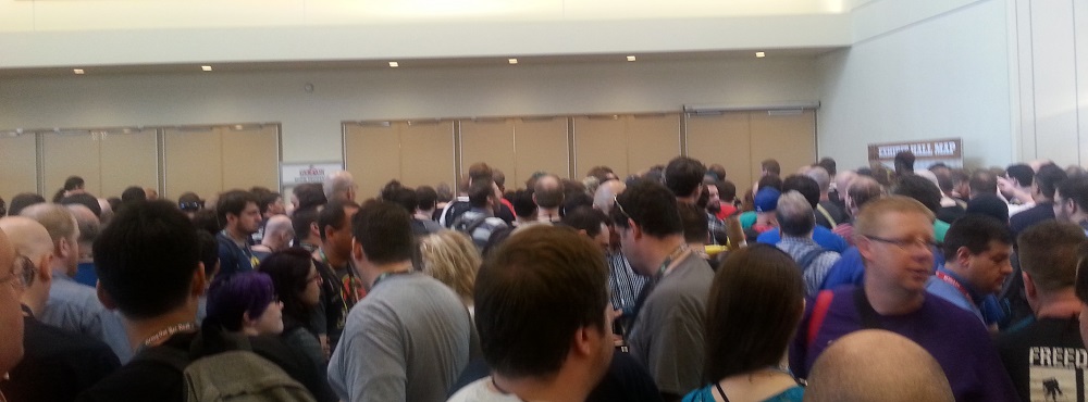 That first day of GenCon, all the early risers packed like upright sausages around the barred doors of the expo hall, it’s hard to fathom how it could get more crowded. Geoff even said that very thing about ten minutes before the doors opened for the first time. “I cannot fathom how this could get more crowded,” he said.